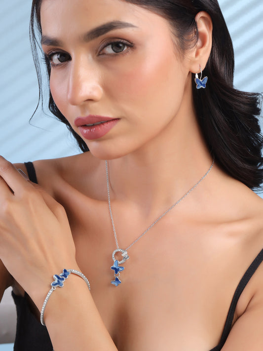 Pendant Set for Women and Girls Blue Crystal Pendant Set | Silver Tone Butterfly Pendant With Earrings & Bracelet Set | Birthday Anniversary Gift for Wife Valentine Gift for Girls