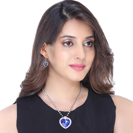 Pendant Set for Women Valentine Special Mesmerizing Silver Plated Titanic Blue Ocean Heart Crystal Pendant Set for Girls and Women.