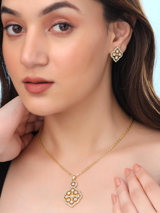 Gold Plated Pendant Set: White Stone Necklace with A5 Crystals | Includes Drop Earrings | One Size | Gold