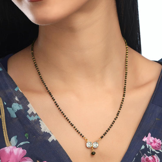 Gold Plated Mangalsutra Set: American Diamond Pendant Necklace | 42 cm | Black Beads | For Women
