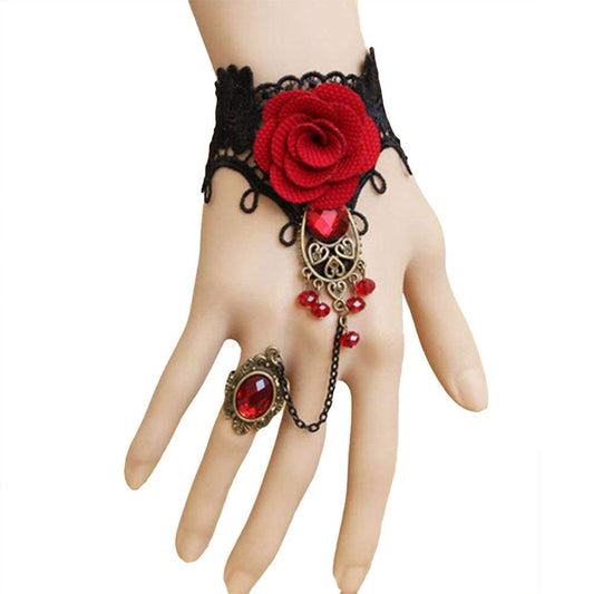 Designer Collection Gothic Red Black Rose Lace Hand Harness with Adjustable Finger Ring Charm Bracelet for Women and Girls