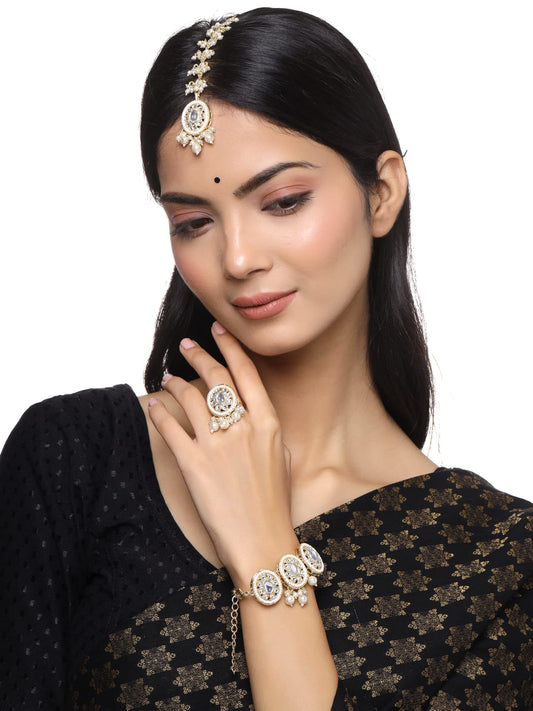 Bracelet Ring and Maangtikka Set for Women and Girls Gold Plated Kundan and Beads Studded Jewellery Set for Women and Girls