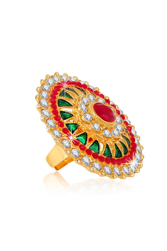 Women's Traditional Cocktail Adjustable Stone Gold Plated Stone Studded Big Floral Shaped Finger Ring Pink and Gold
