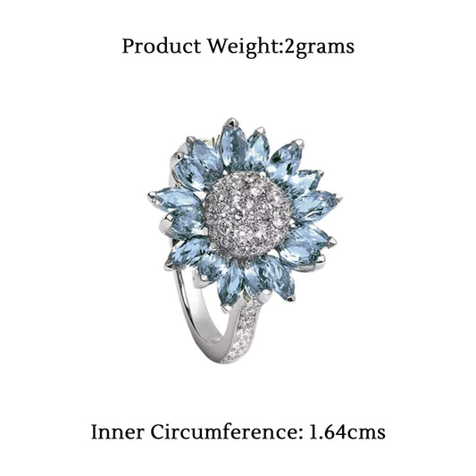 Rings For Women Floral Designed Aquamarine Blue And White Crystal Stoned Sunflower Shaped Silver Plated Rings For Women And Girl's - Size 8