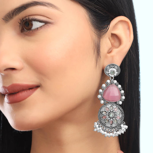 Earrings for Women and Girls Traditional Long Dangler Earrings | Oxidised Silver Plated Pink Stone Studded Long Danglers | Birthday Gift for Girls and Women Anniversary Gift for Wife