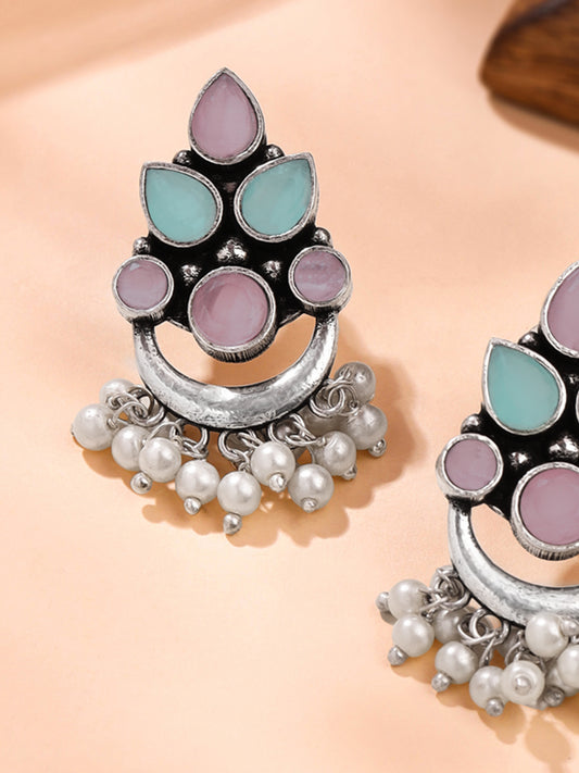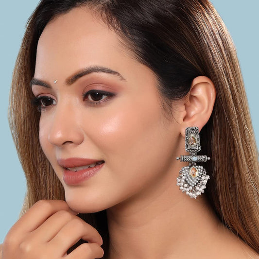 Earrings for Women and Girls Silver Oxidised Drop Earrings |White Beads Drop Stone Studded Drop Earrings|Birthday Gift For girls and women Anniversary Gift for Wife