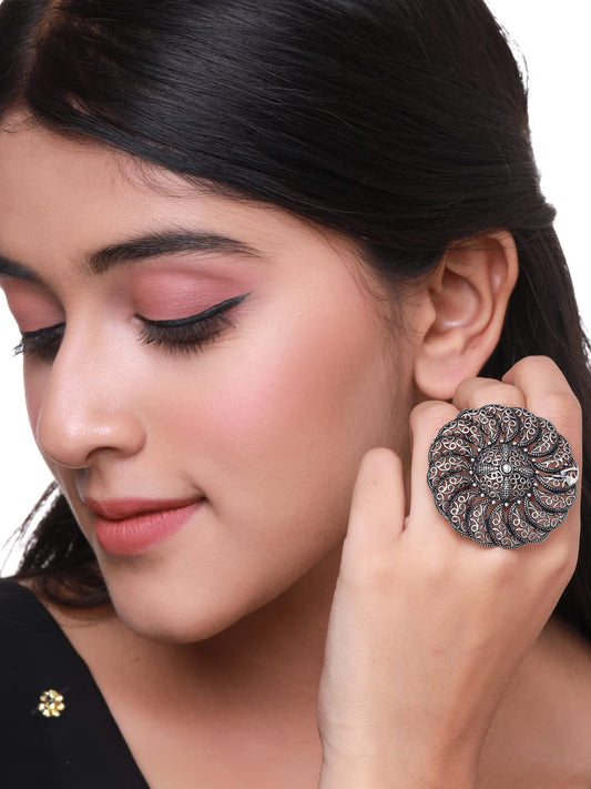 Rings for Women and Girls | Traditional Silver Oxidised Ring Set | Big Charm Floral Shaped Oxidised Rings for Girls | Floral Shaped Combo for Women | Accessories Jewellery for Women | Birthday Gift for Girls and Women Anniversary Gift for