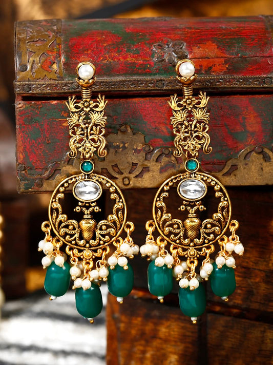 Earrings for Women Oxidised Gold Pearl Crystal Studded Green White Beads Drop Dangler Drop Earrings for Women and Girls