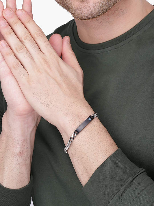 Bracelet for Men Stainless Steel Silver Chain Black Tag with Crystal Unisex Bracelet for Men and Women
