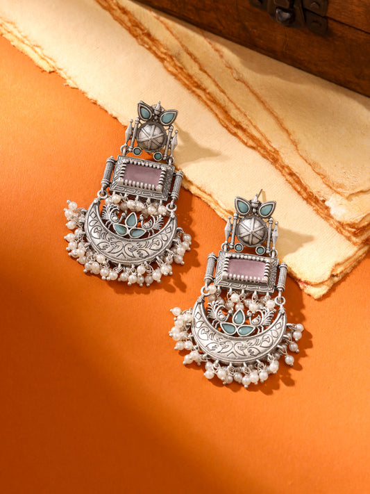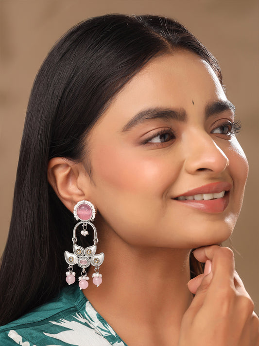Drop Earrings: Silver Oxidised Pink Stone with Elegant Design | 7.7cm | Traditional Style | Silver
