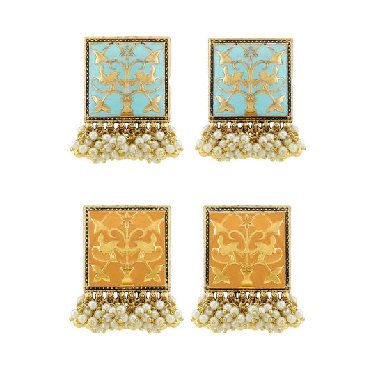 Stud Earrings for Women Combo of 2 pairs Green & Yellow Meenakari Moti Design Traditional Stud Earrings for Women and Girls.