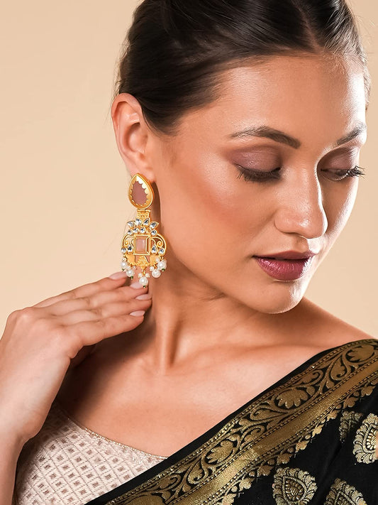 Drop Earrings for Women Traditional Gold Plated Studded Pink Stone Ethnic Dangler Drop Earrings for Women and Girls