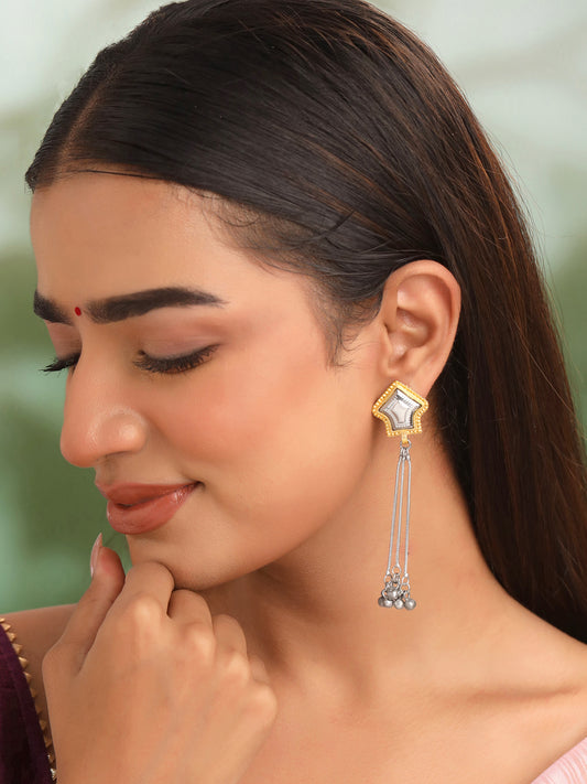 Dual Tone Earrings: Traditional Silver Oxidised Dangler with Gungroo | One Size | Gold & Silver