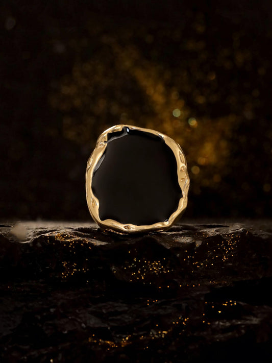 Adjustable Golden Ring: Big Black Chunky Statement Ring | Size 7 | Gold Plated | For Women