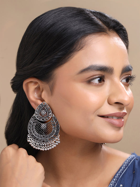 Silver Oxidised Dangler Earrings: Elegant Design | Push Back Closure | 6cm x 5.2cm | Silver