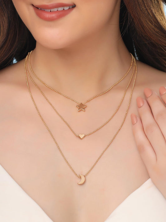 Multi Layered Chain Necklace: Fashion Gold Plated Choker with Moon, Heart, Star | One Size | Gold