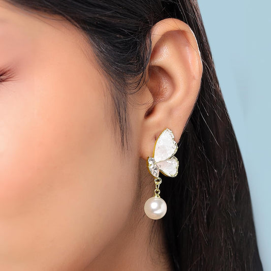 Earrings for Women and Girls Fashion White Drop earrings | Gold Plated Crystal Butterfly Pearl Drop Earrings | Birthday Gift for Girls and Women Anniversary Gift for Wife