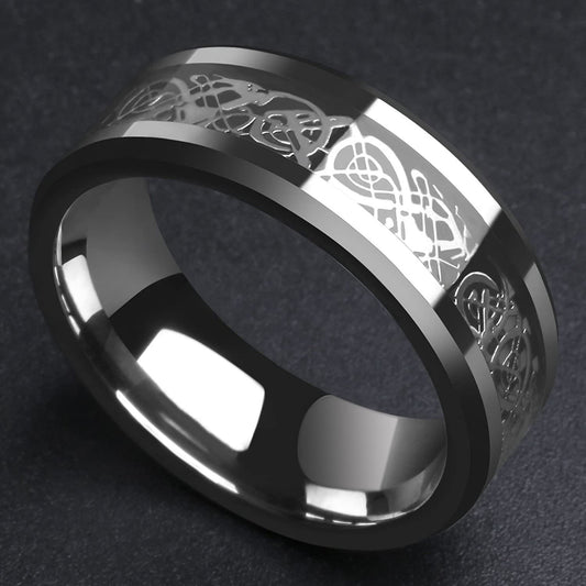 Rings for Men Dragon Celtic Inlay Polish Finish Silver Base Titanium Steel Ring for Men and Boys.