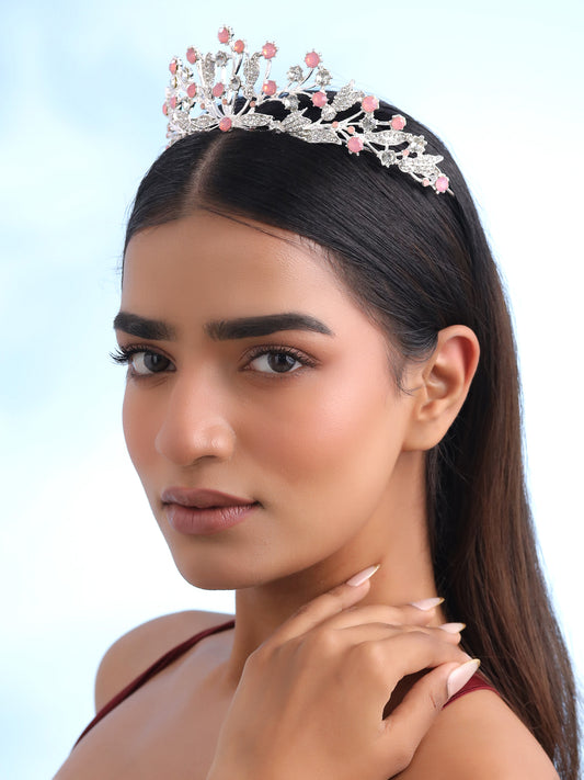 Tiara for Women and Girls Silver Plated Crown for Women Leafy Floral Pink Crystal Studded Bridal Wedding Crown Tiaras for Women and Girls Gift For Women & Girls Valentine Gift for Girls