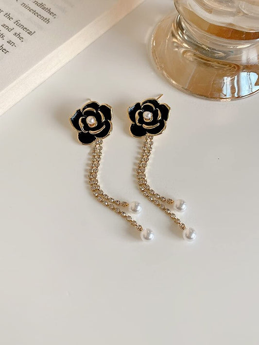 Earrings For Women Black Flower Stud With Linear Chain Hanging Pearl Drop Dangler Earrings For Women and Girls