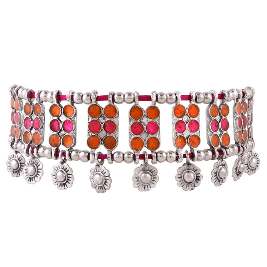 German Silver Oxidized Designer Antique Look Modern Style Neck Strap Versatile Choker Necklace for Women and Girls (Pink)