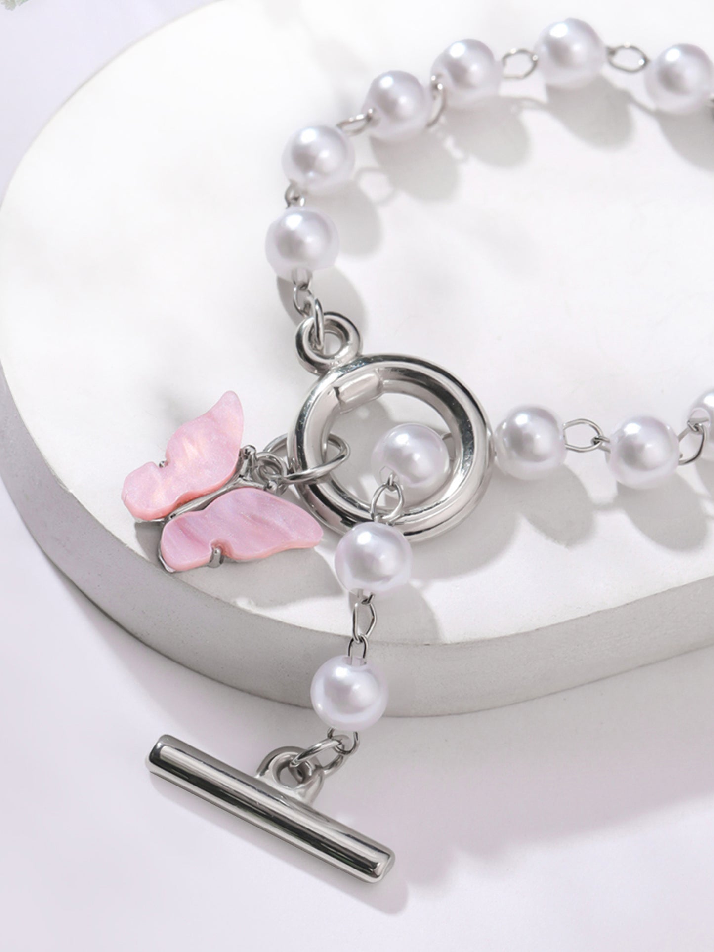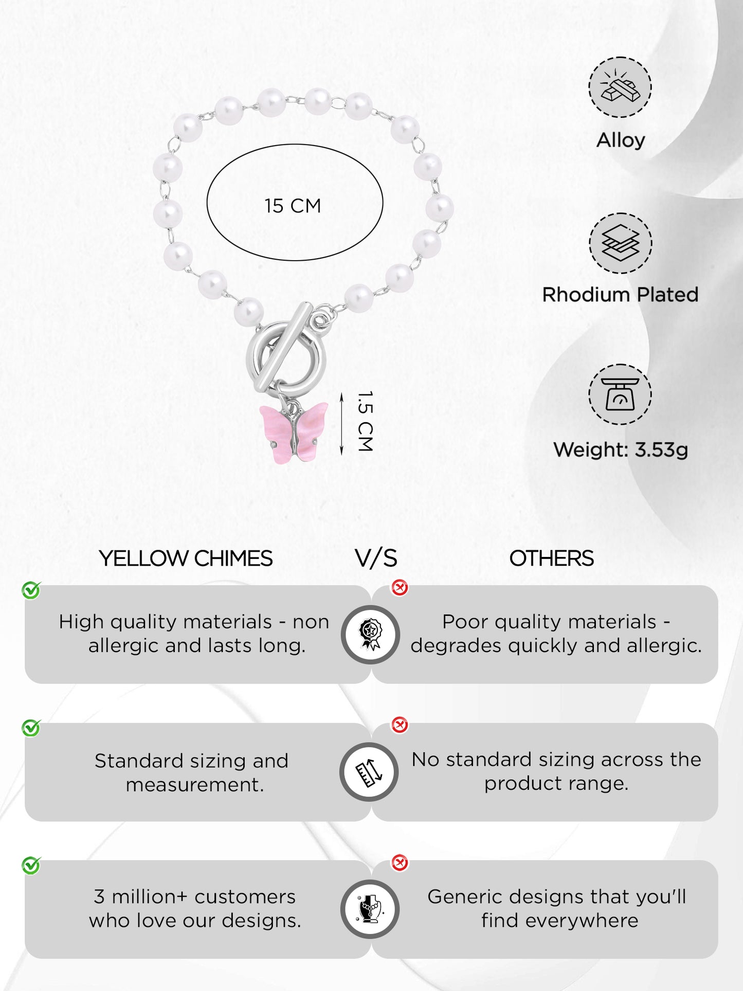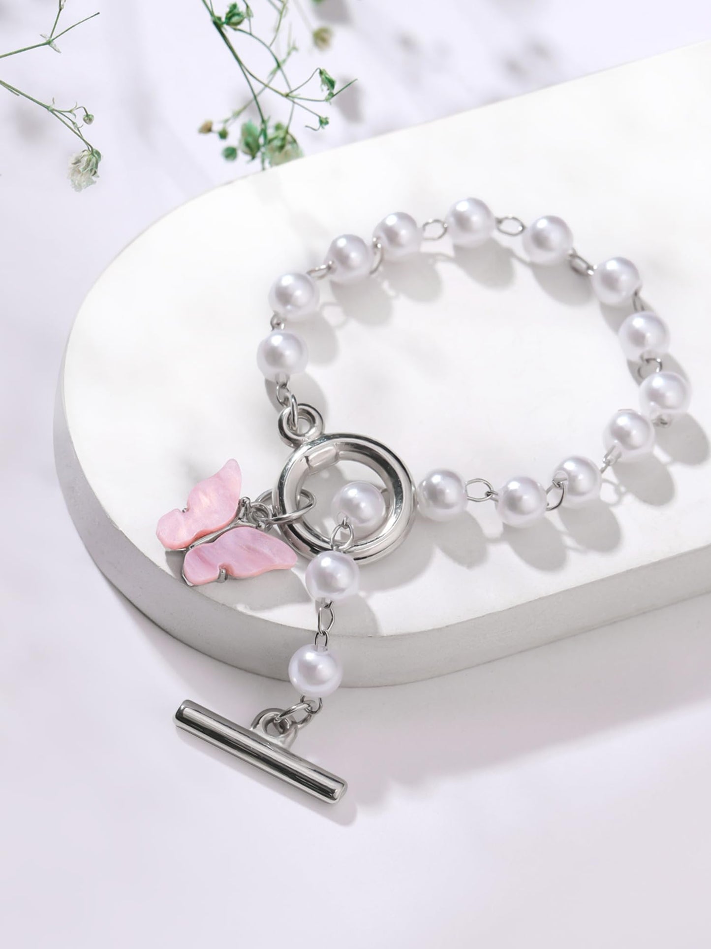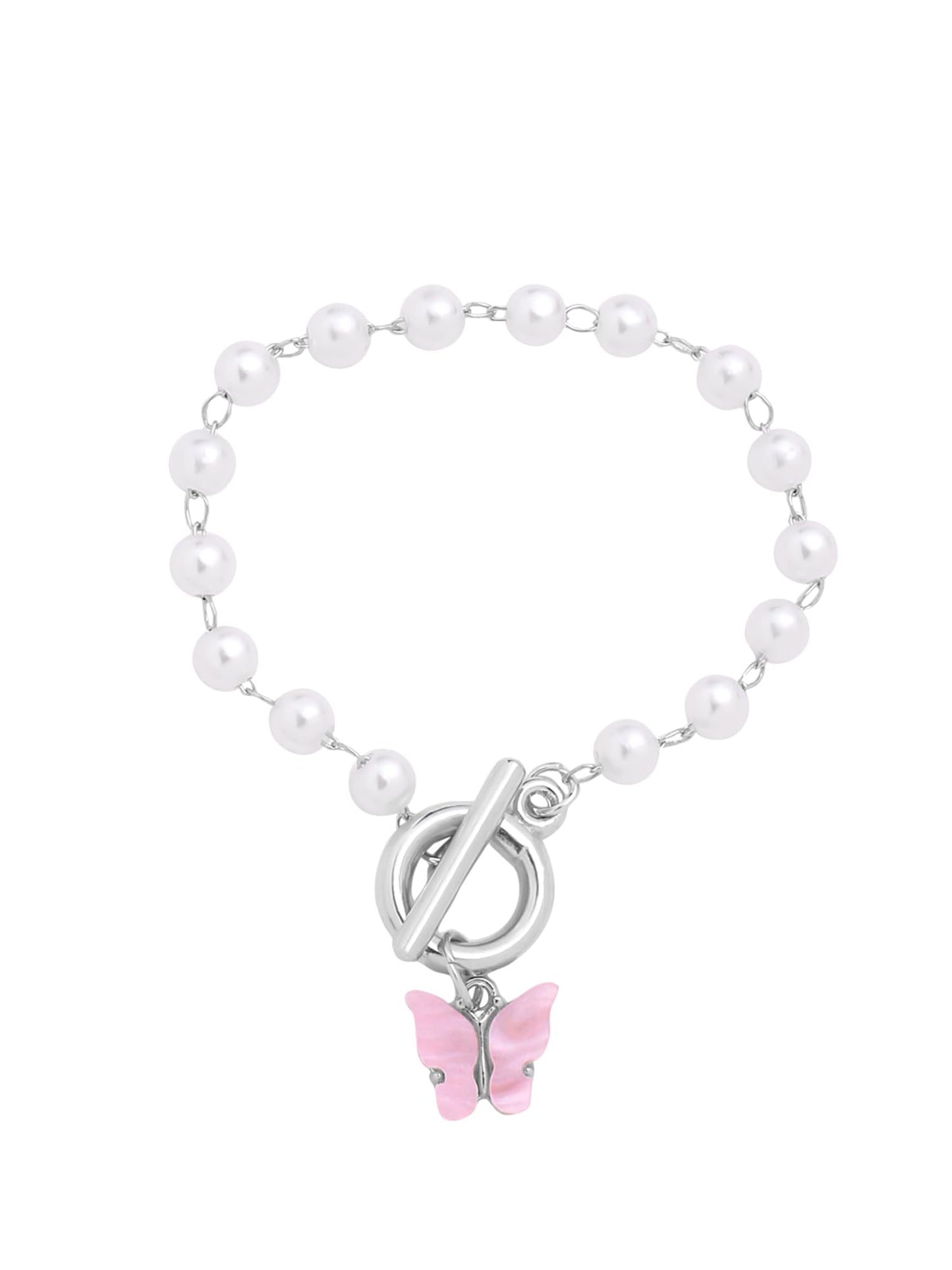 Butterfly Charm Pearl Bracelet: Elegant White Fashion Accessory | One Size | Rhodium Plated