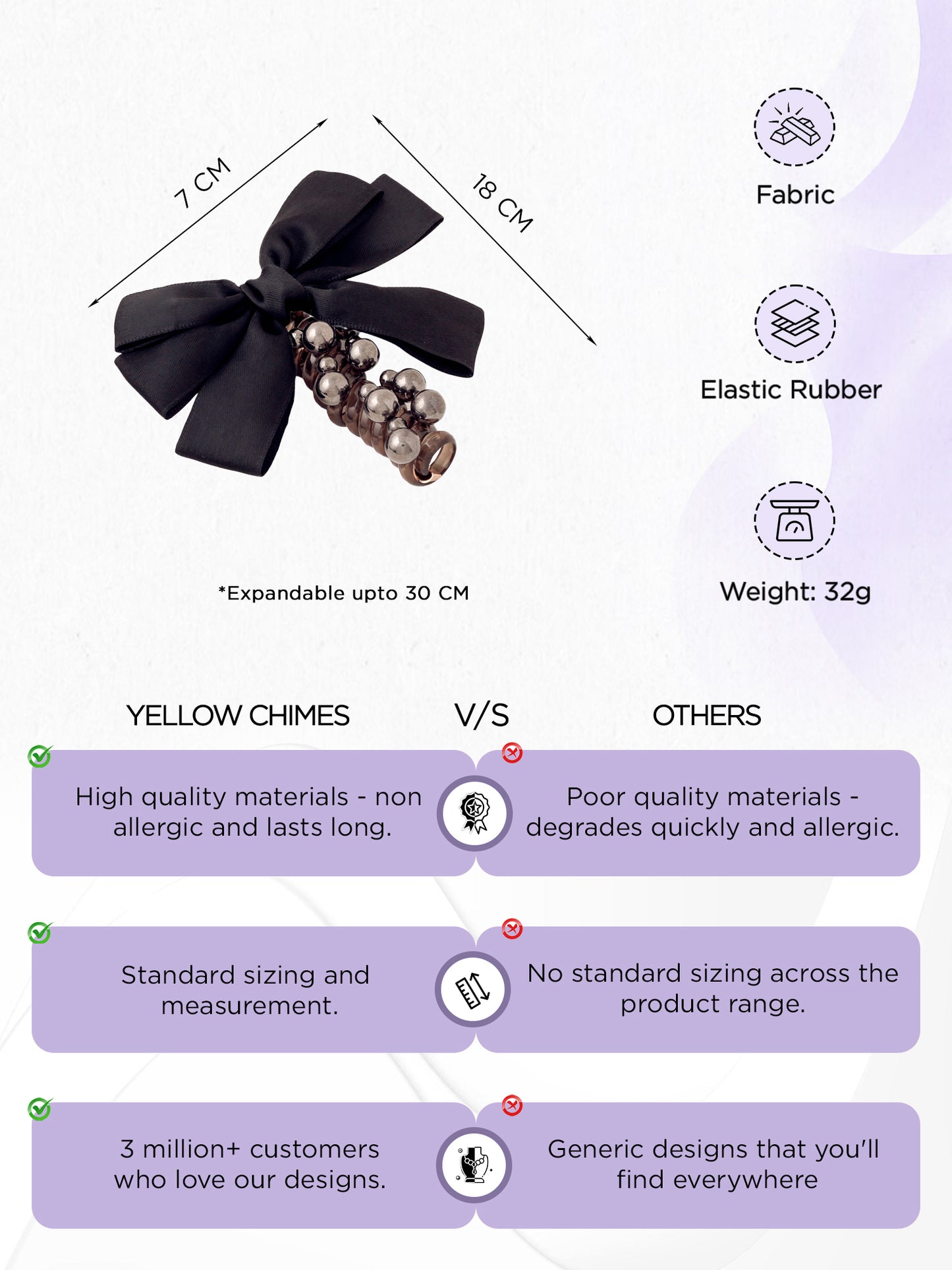 Introducing the Combo of 2 Bow Rubber Bands by Yellow Chimes, designed to enhance your hair styling. These hair accessories come in a chic black and white color scheme, offering a perfect blend of elegance and durability. Each set includes two elastic rubber bands crafted from high-quality fabric, ensuring a highly elastic fit and a secure hold without slipping. Ideal for various occasions, these versatile bands are a must-have for any hair care collection.