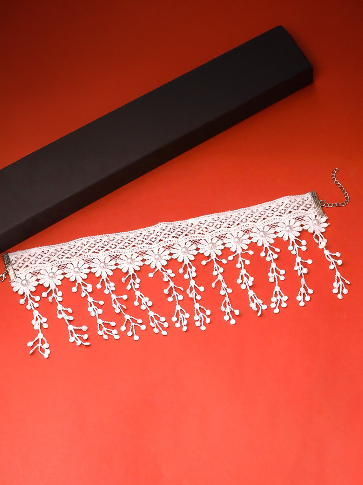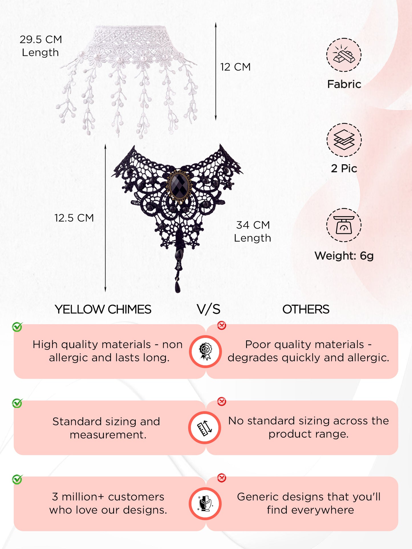 Introducing the Combo of Black & White Fabric Lace Chokers by Yellow Chimes, your go-to fashion accessory. This set features two stylish chokers, one black and one white, crafted from high-quality fabric. The adjustable design allows a perfect fit for various neck sizes, making it suitable for all occasions. The black choker measures 34 cm in length and 12.5 cm in width, while the white choker is 29.5 cm long and 12 cm wide, ensuring versatility and style wherever you go. The elegant lace design complements both Western and Indo-Western outfits with ease, making these chokers a fantastic addition to your jewelry collection. Each piece arrives in exquisite packaging, ensuring they reach you in pristine condition, perfect for gifting or personal use.