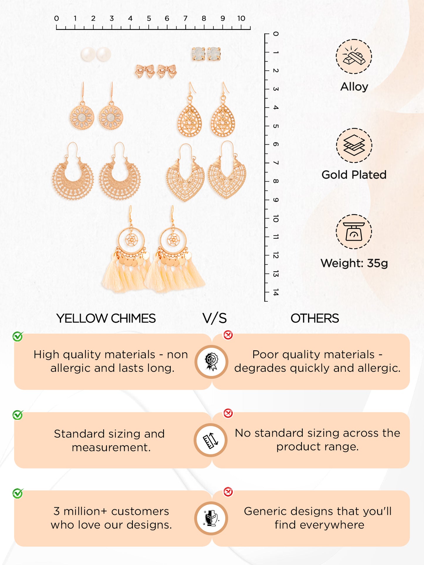 Introducing the Fashion Golden Women Earrings Set by Yellow Chimes. This stunning combo of 8 pairs of gold plated hoop earrings is crafted from a durable alloy, ensuring a lightweight feel without sacrificing style. Each earring features a smooth texture that adds elegance to any outfit, making it perfect for any occasion. The average earring length is 3.5 cm with a width of 2 cm, and they weigh only 15 grams, ensuring comfort throughout the day. Delivered in an elegant Yellow Chimes box, your jewelry will arrive at your doorstep in pristine condition!