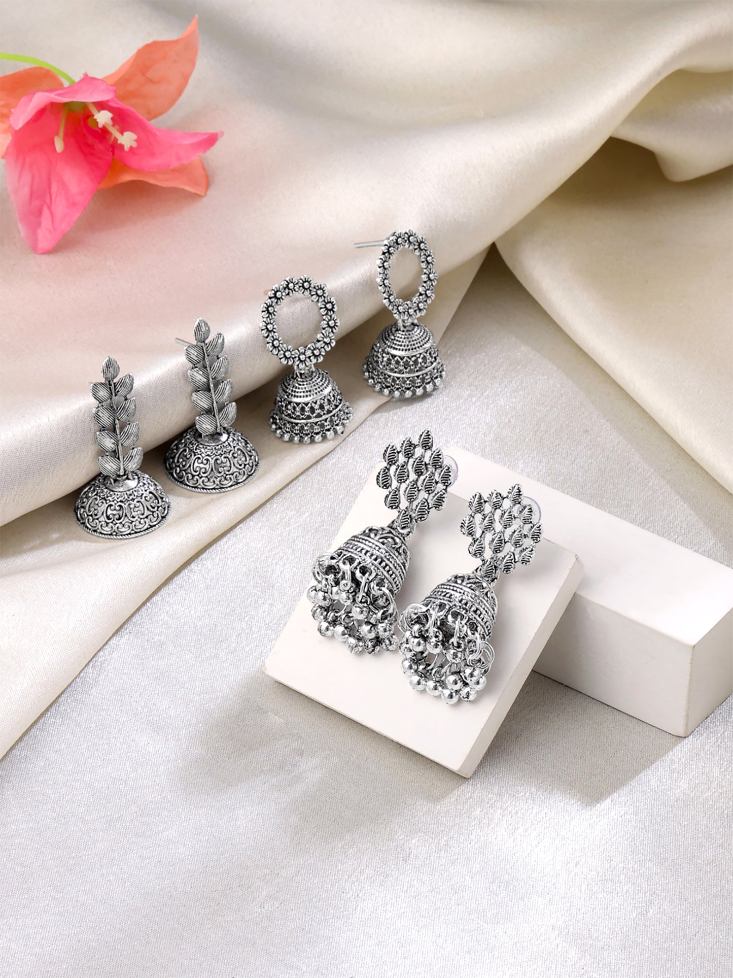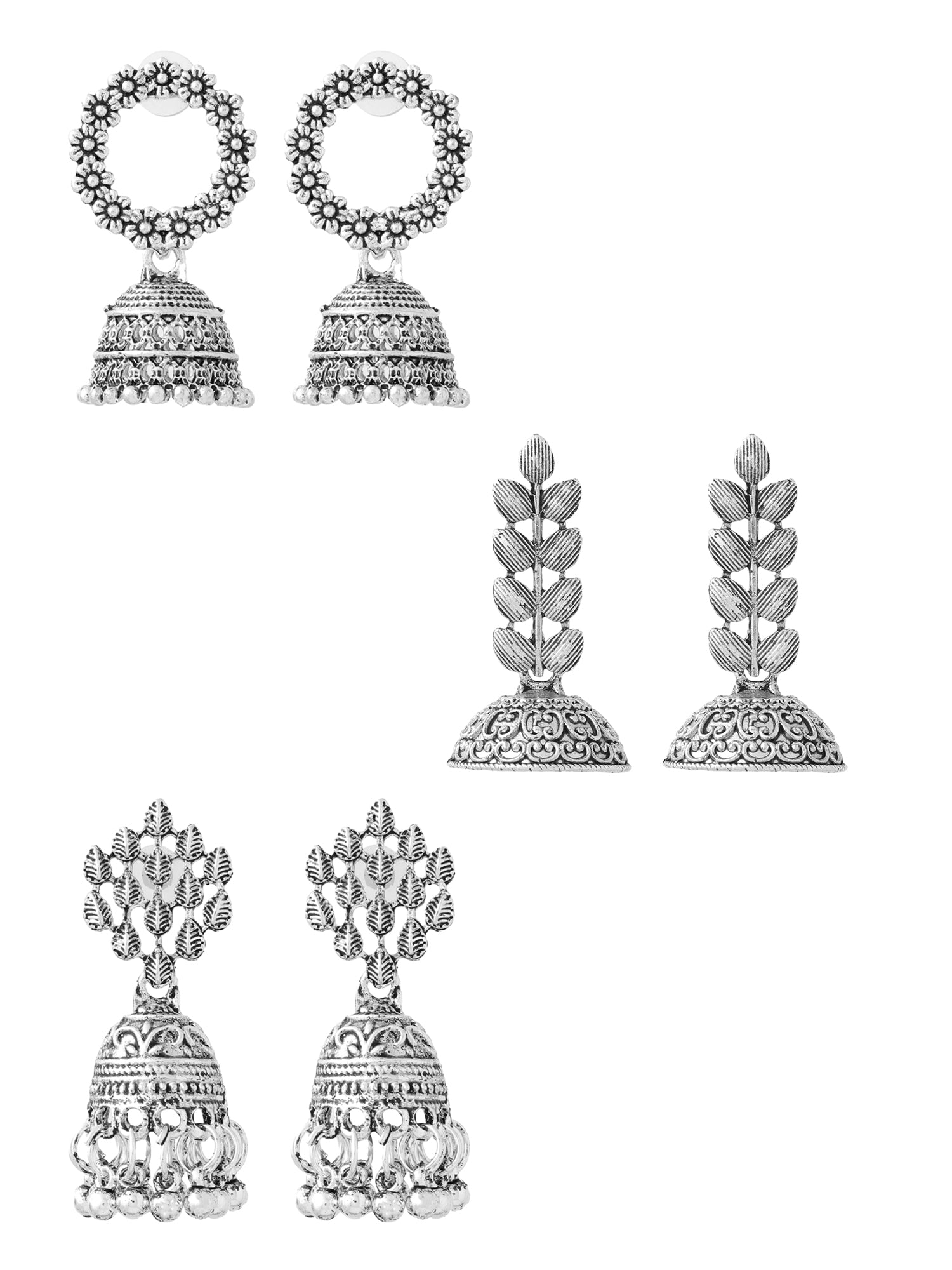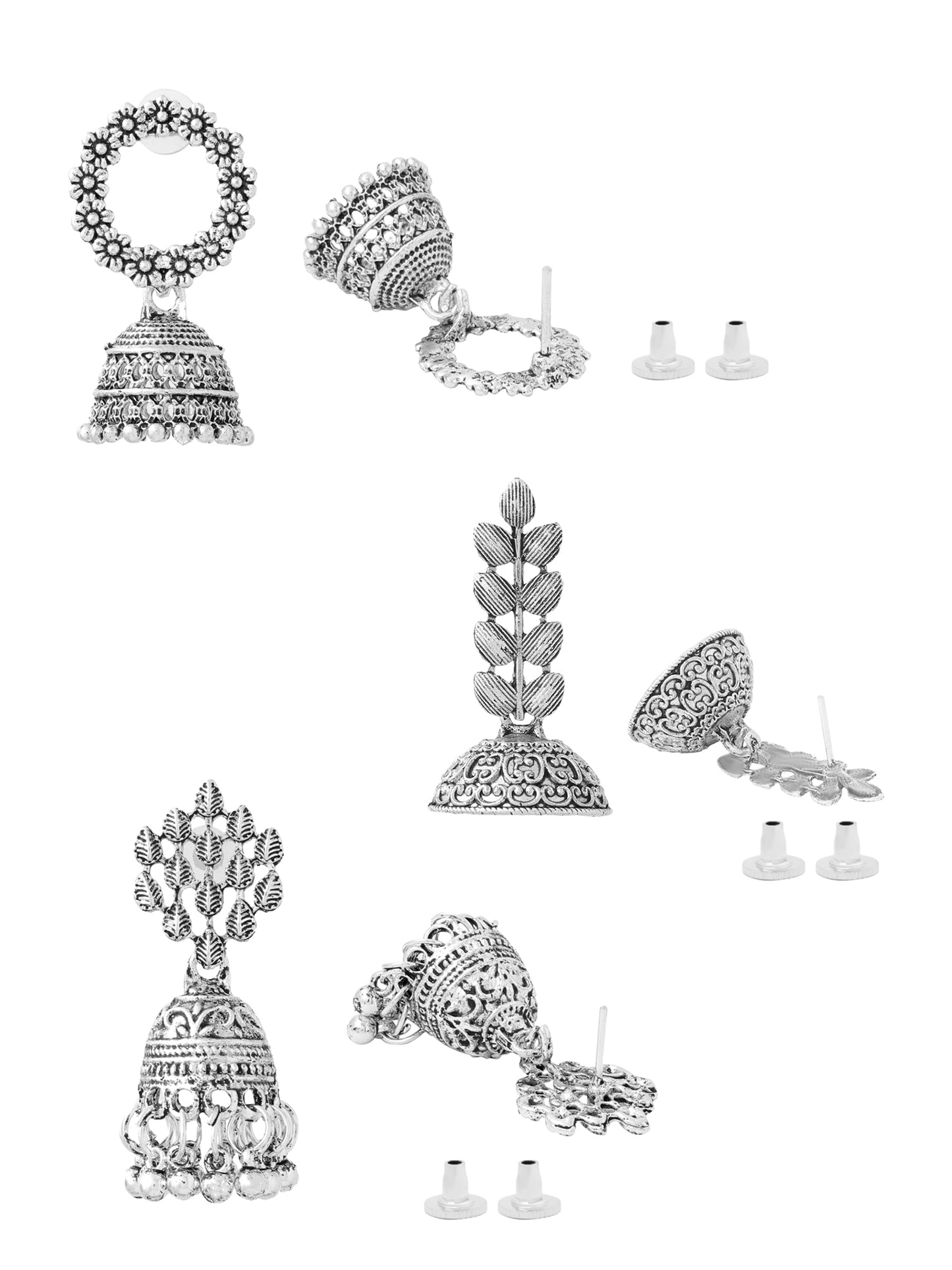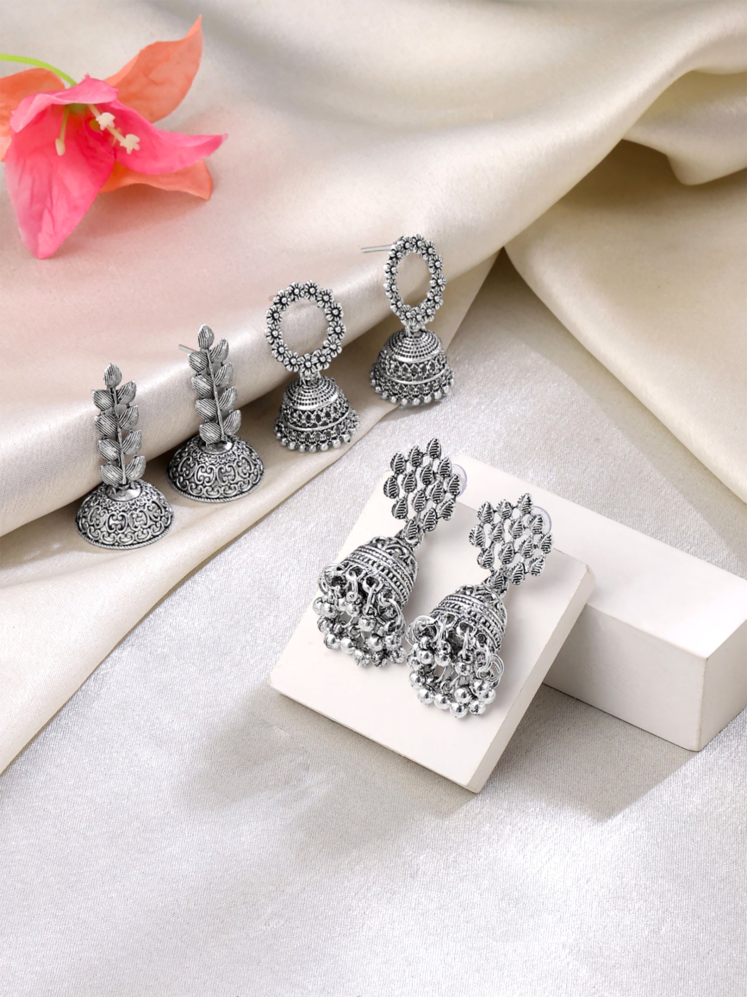 Combo of 3 Pairs: Silver Oxidised Jhumka Earrings with Beautiful Designs | 4.5 cm | Silver Oxidised