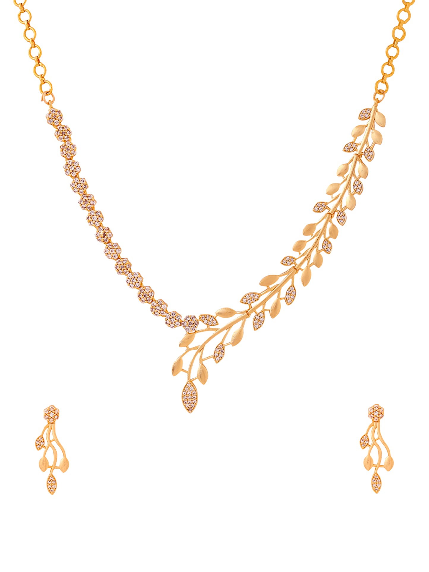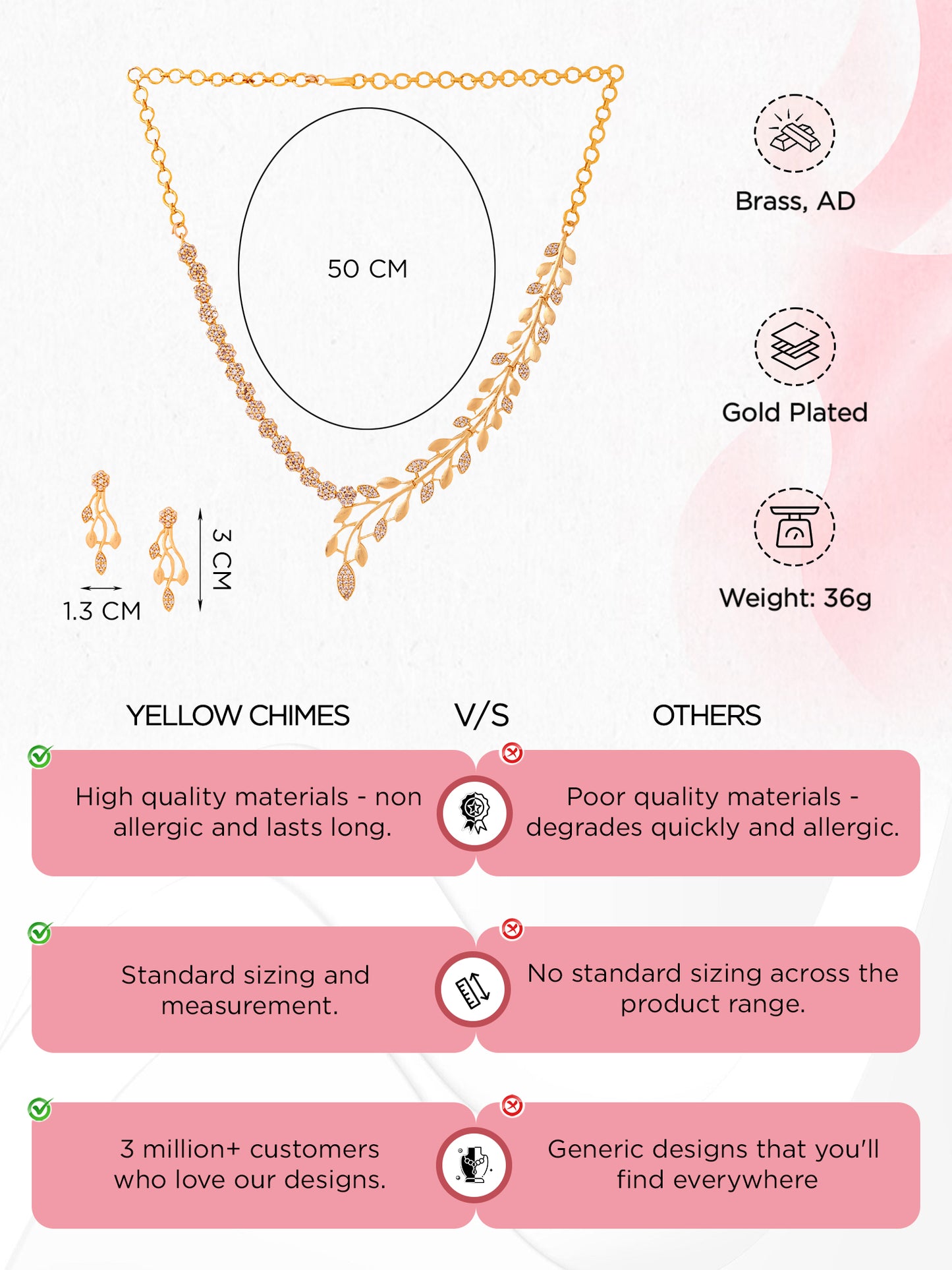 Introducing the Diamond Necklace Set for Women by Yellow Chimes, a stunning piece crafted to elevate your style. This exquisite jewellery set features a beautiful white stone and is elegantly gold-plated, making it a perfect choice for any occasion. With a necklace length of 48 cm and earrings measuring 2.1 cm in length and 1.2 cm in width, it offers an ideal fit. Weighing only 24 grams, this set's lightweight design ensures comfort during wear. Additionally, it comes packaged in a stylish box, ensuring it arrives safely at your doorstep.