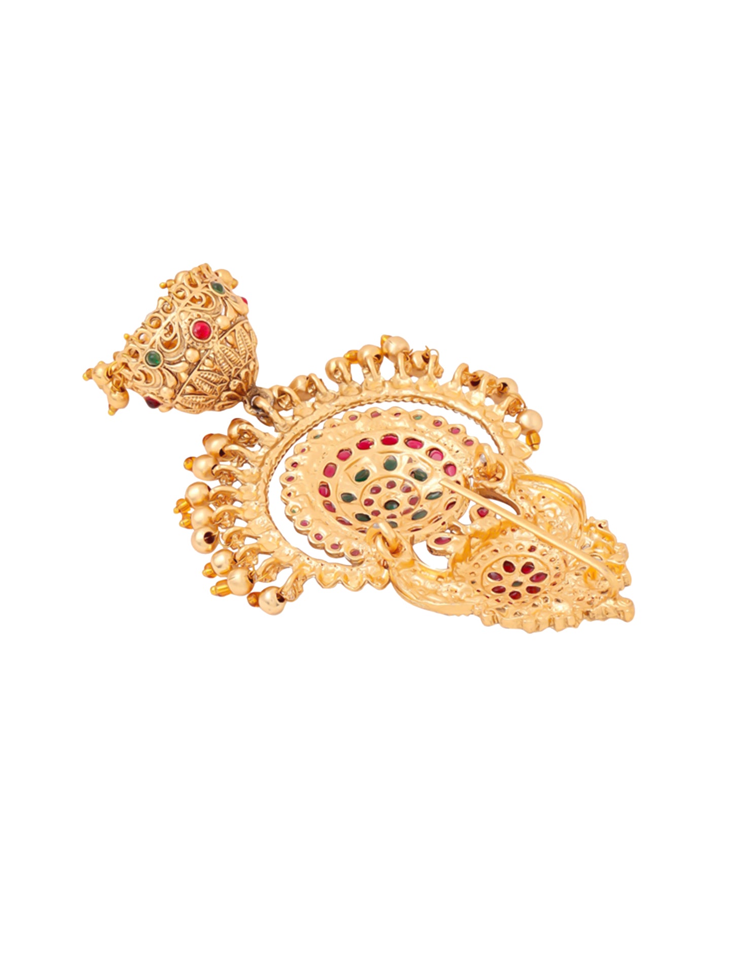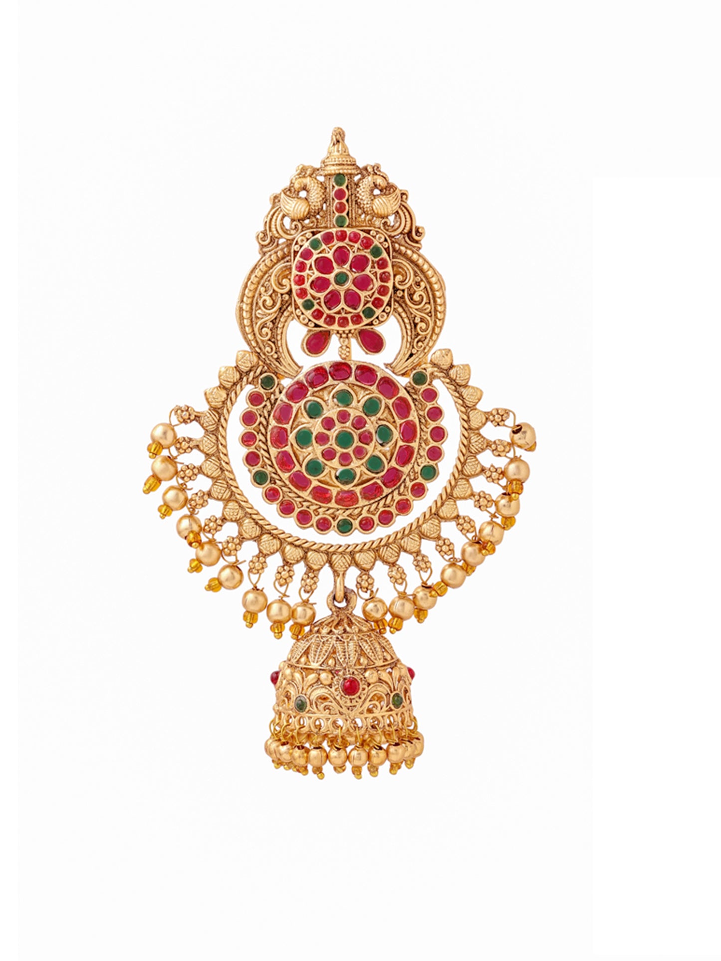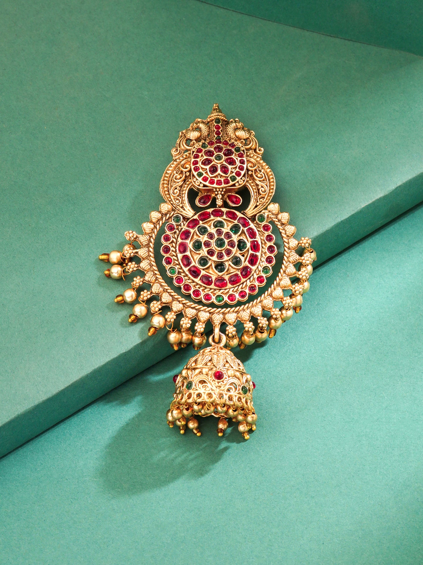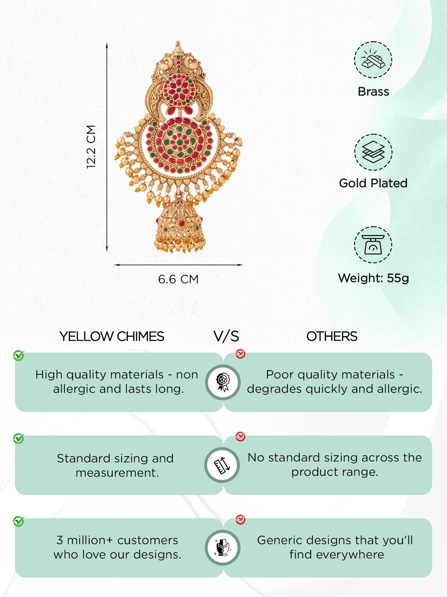 Introducing the Gold Plated Juda Pin by Yellow Chimes, a stunning hair accessory designed for brides and special occasions. Measuring 12.2 cm, this traditional juda pin is crafted from high-quality brass and elegantly gold-plated, making it the perfect complement to your bridal hairstyle. The pin ensures your hair remains beautifully styled throughout the day, reflecting elegance and charm.