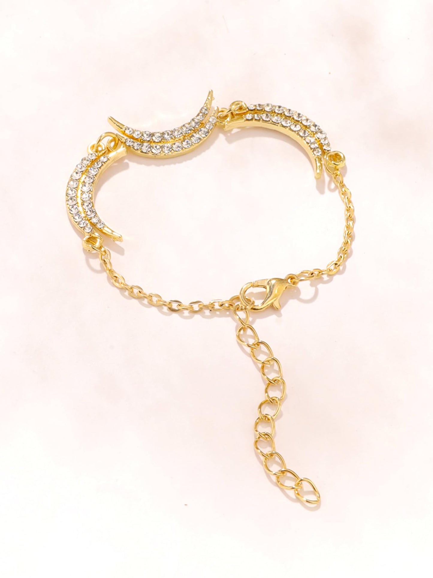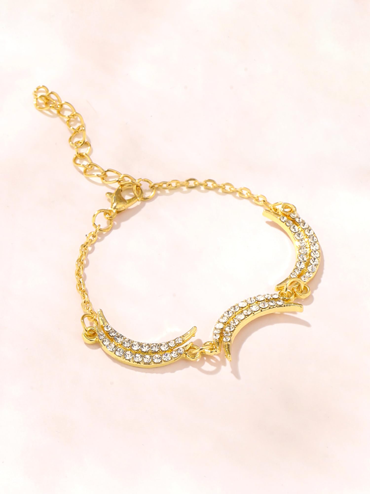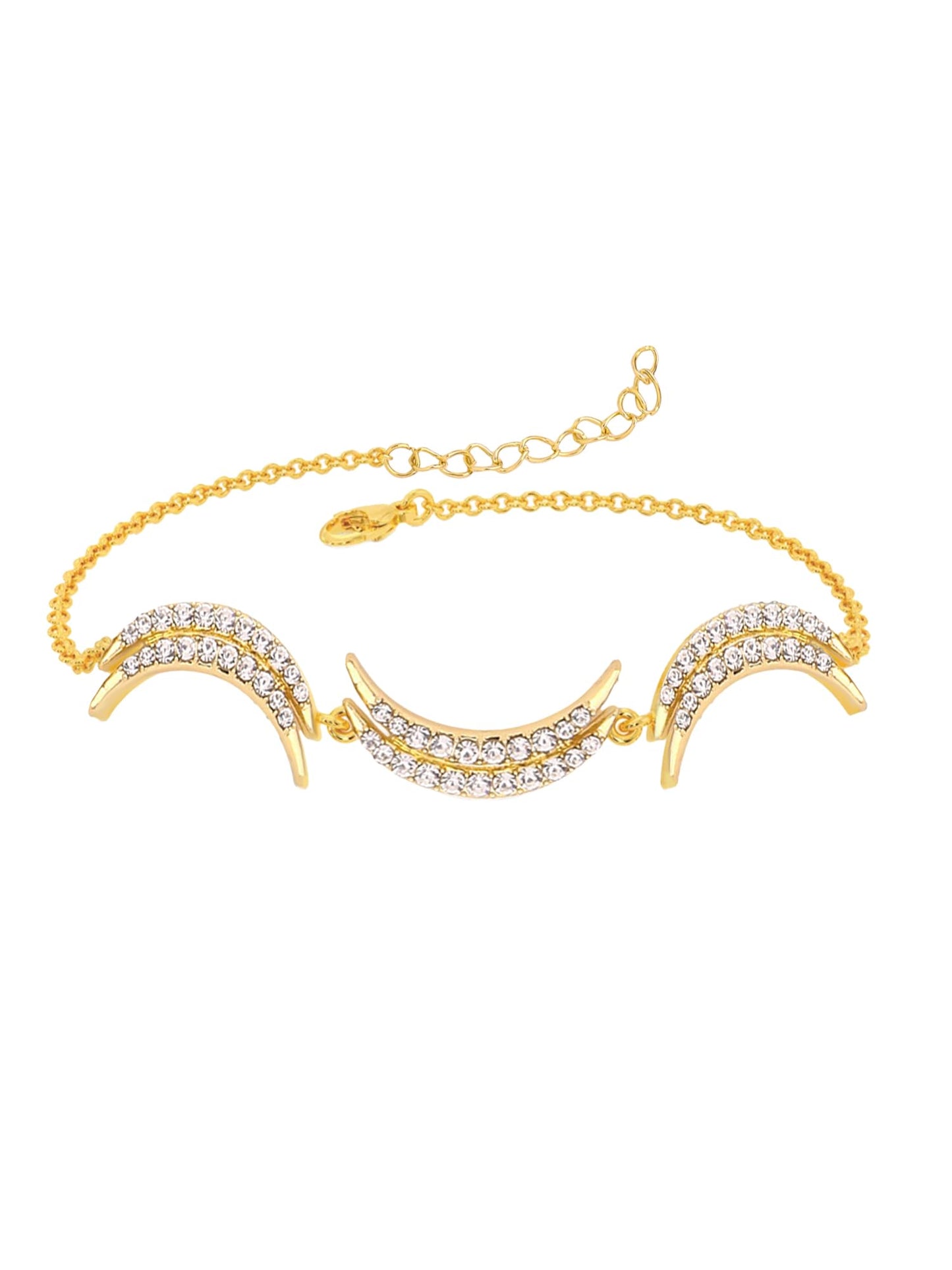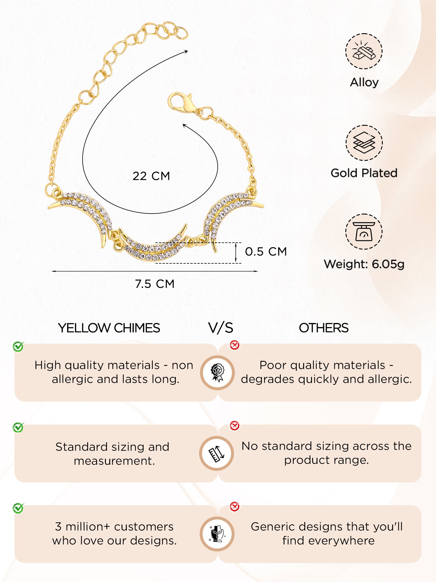 Introducing the Golden Moses Bracelet by Yellow Chimes, the perfect accessory for any occasion. This stunning bracelet is designed exclusively for women, featuring a captivating moon-shaped crystal chain adorned with sparkling cubic zirconia. The bracelet is adjustable, ensuring a comfortable fit for all wrist sizes, and its length extends to an impressive 22 cm, making it versatile enough for daily wear and special outings.