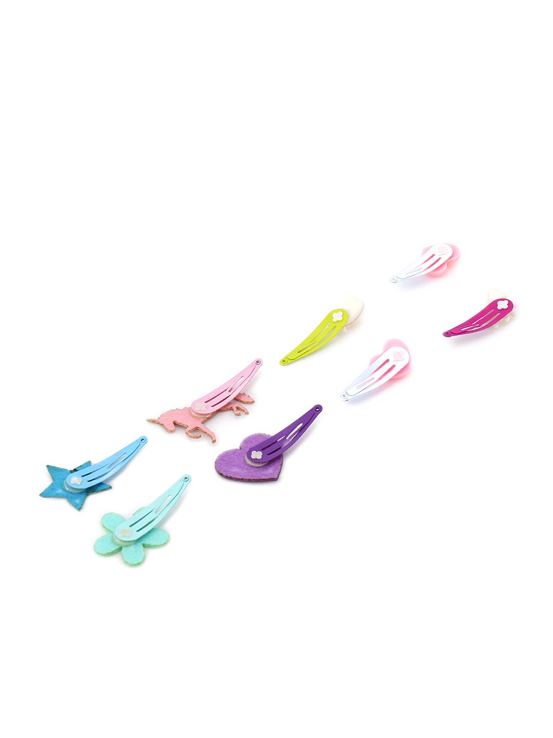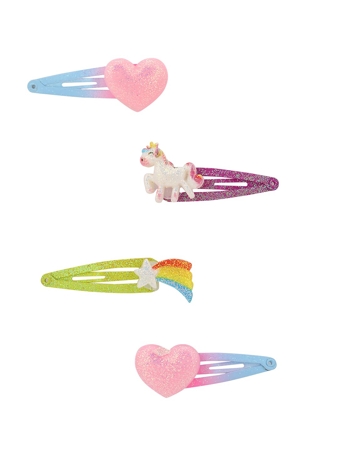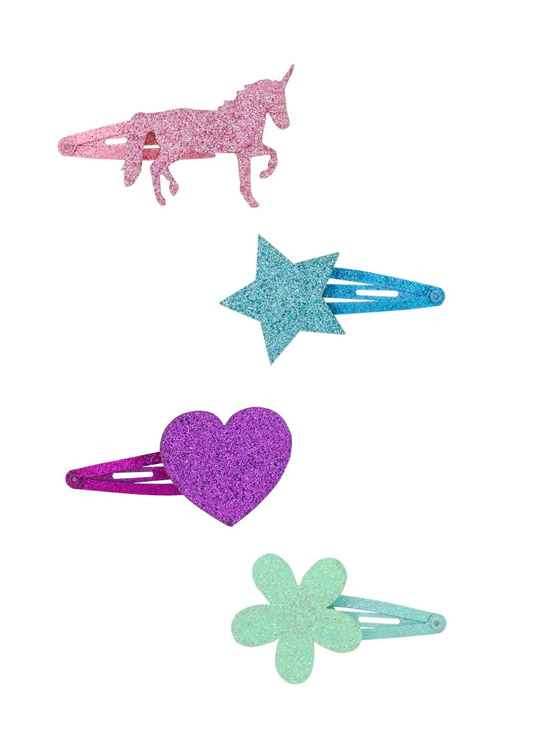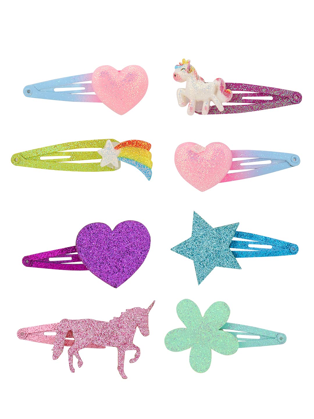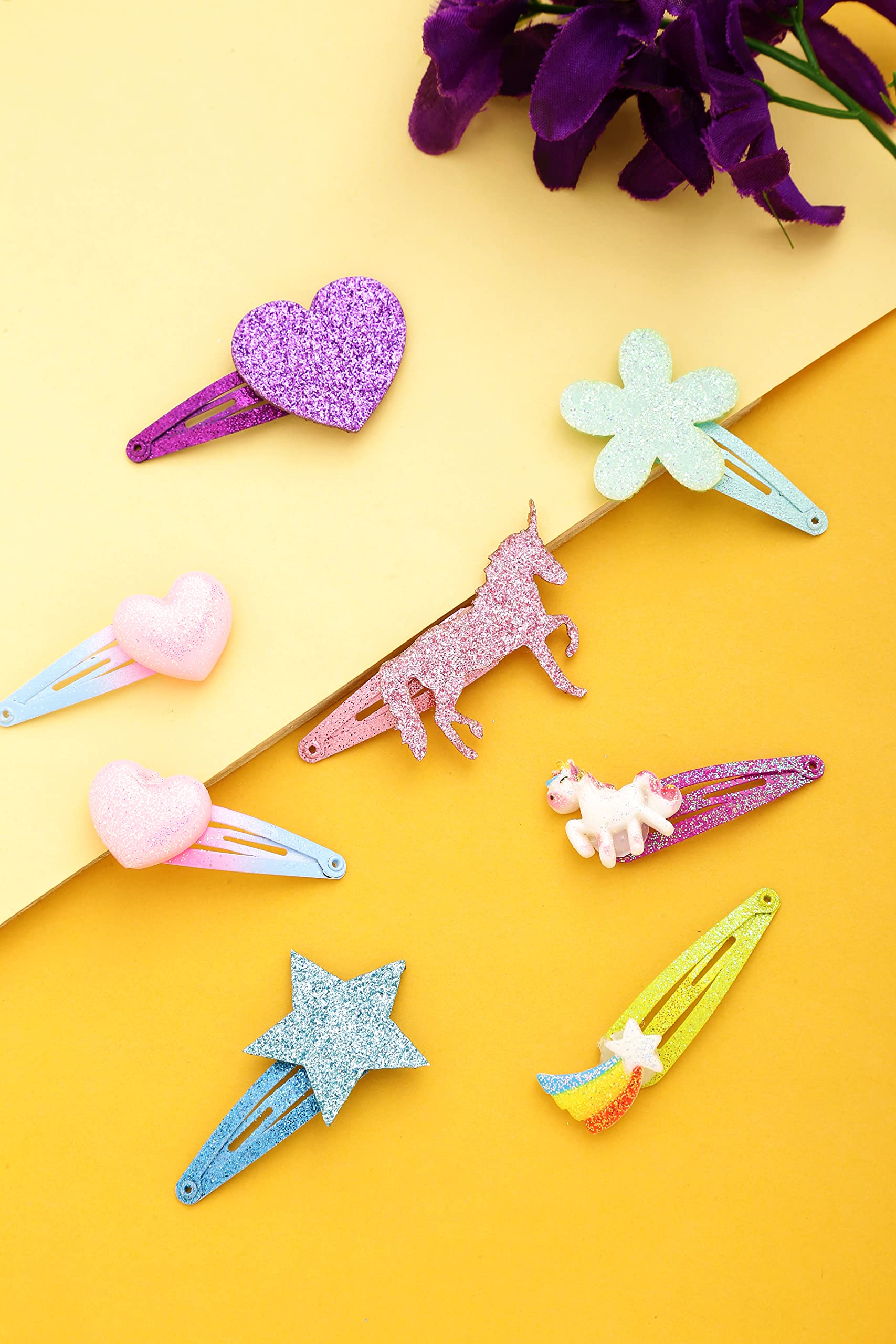 - Elegant and stylish Combo of glittering snap clips with unicorn, heart, star, flower charms in assorted shining colors cute looks for kids and girls