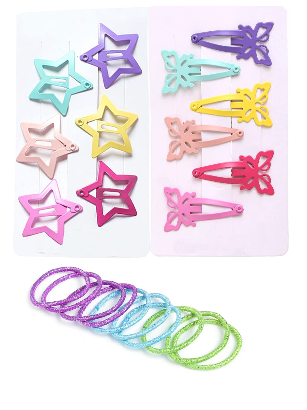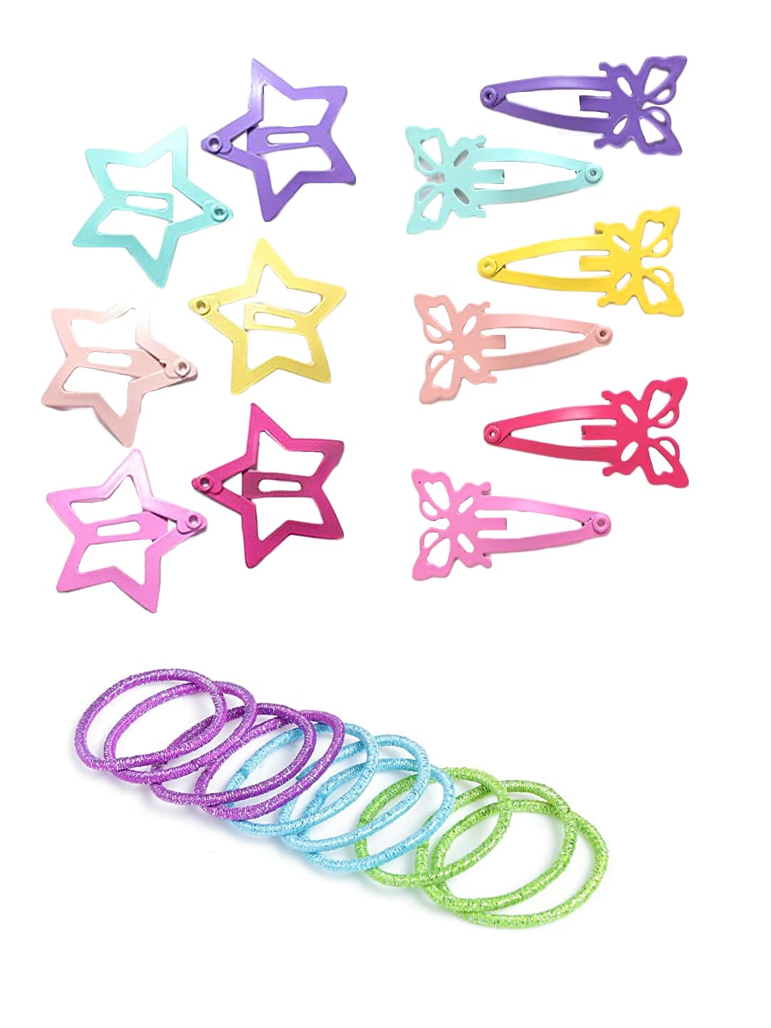 - 22 Units overall. 12 Snap Clips, 10 Hair ties. Size Details- Snap Clip Size- 4 CM Length, 3.2 CM Width, Hair ties Size- 3 CM Diameter, 0.1 CM Width