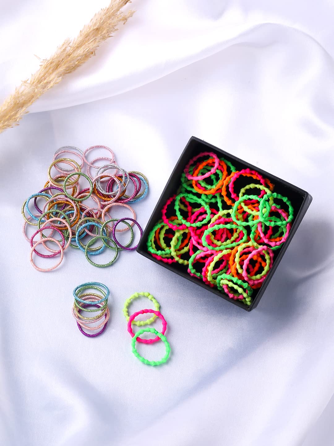 - Multicolor shades in 100 Pcs each- Bright shades and Soft shades- mix colors small rubber bands with storage Box- Great for Hair styling with strong grip.small and lightweight Rubberbands for girls , beautiful and cute Ponytail Holders for girls, durable and unfading for long times wearing.For Baby Girls Teens Toddlers, Assorted Styles For Toddlers.