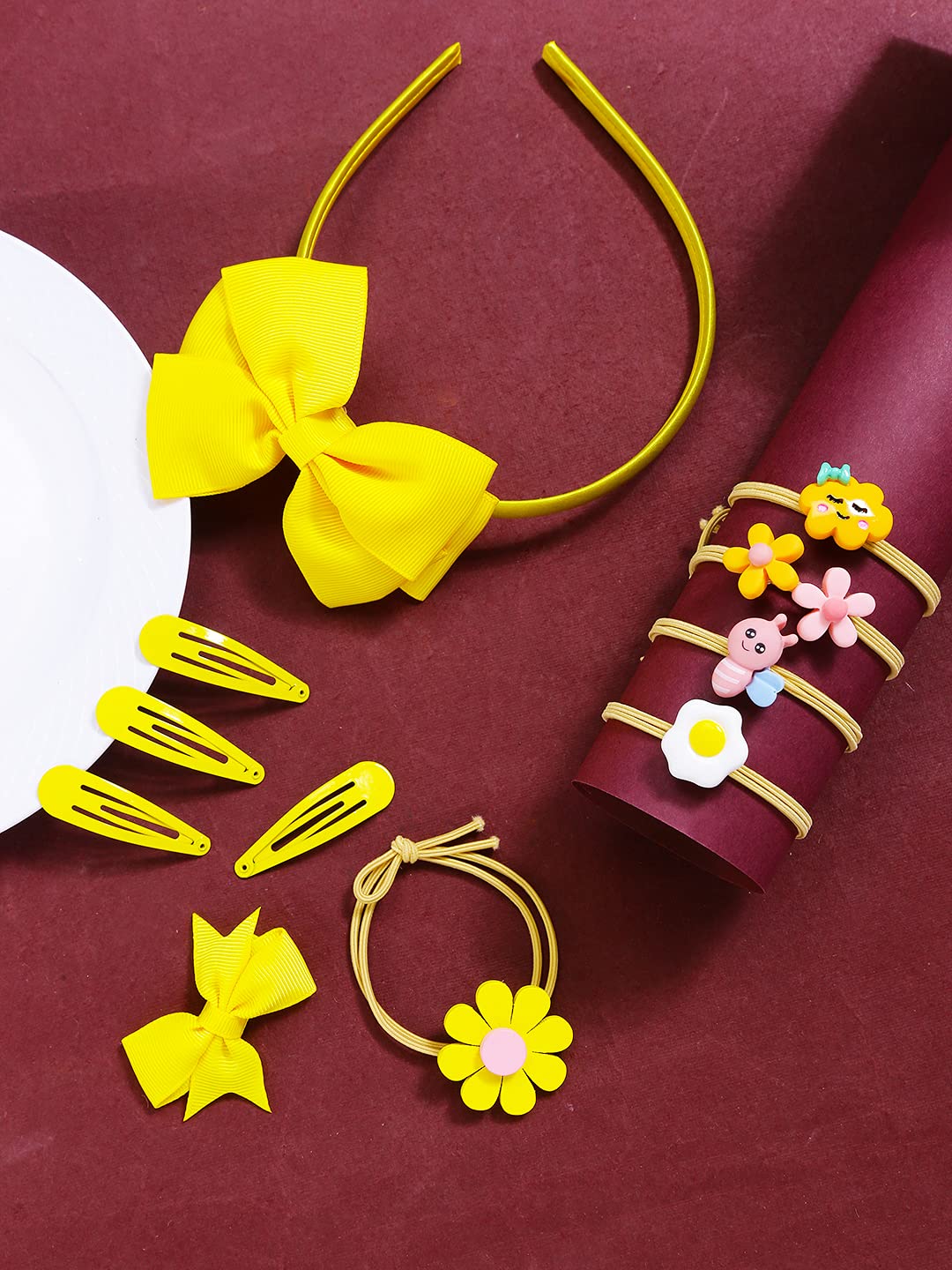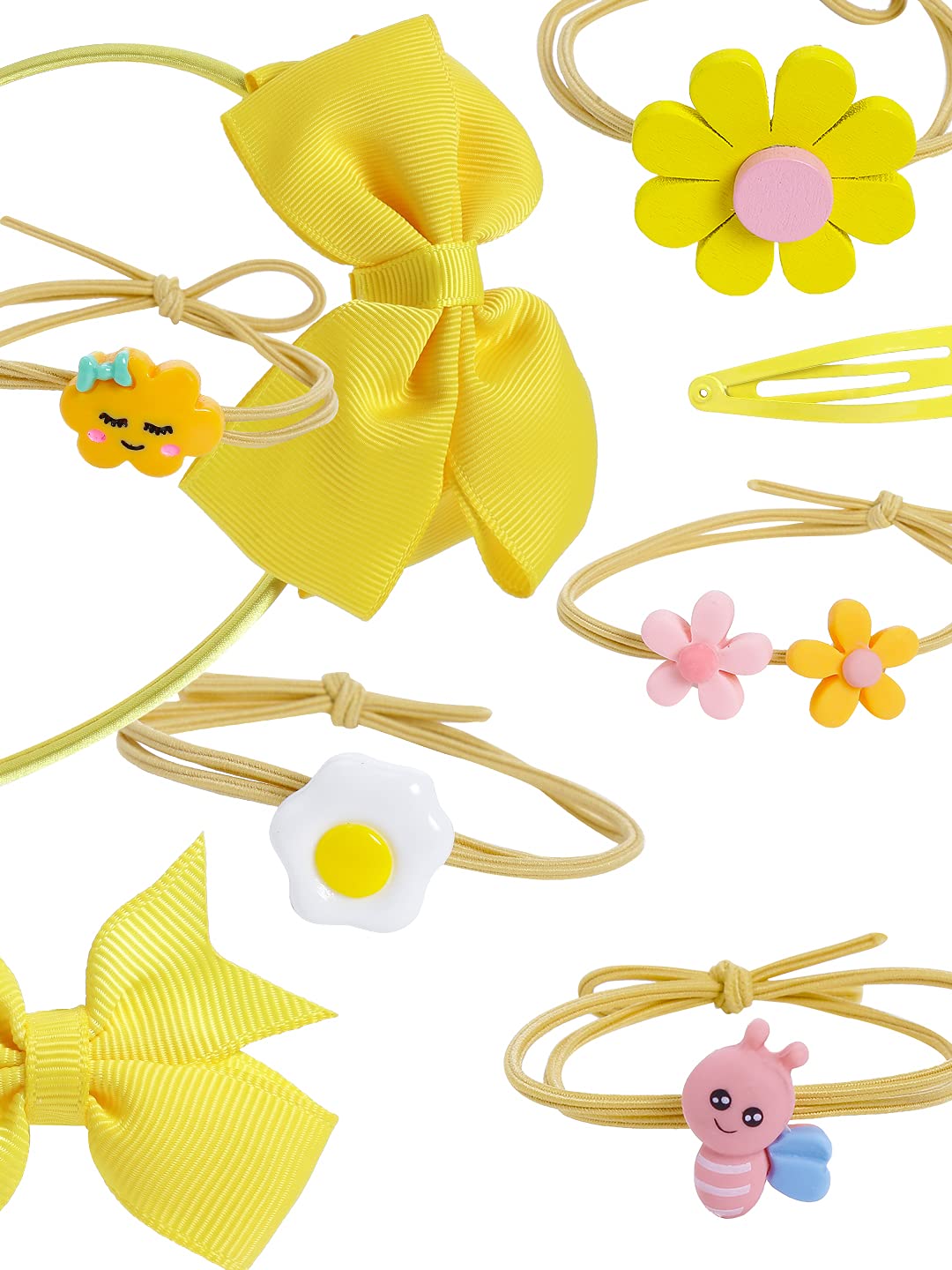 - Set of Yellow Hair Accessories for your kid- Bow HairBands and BowClip, 4 Snap clips and cute charming Ponytail holders that can make her Day Sunny!