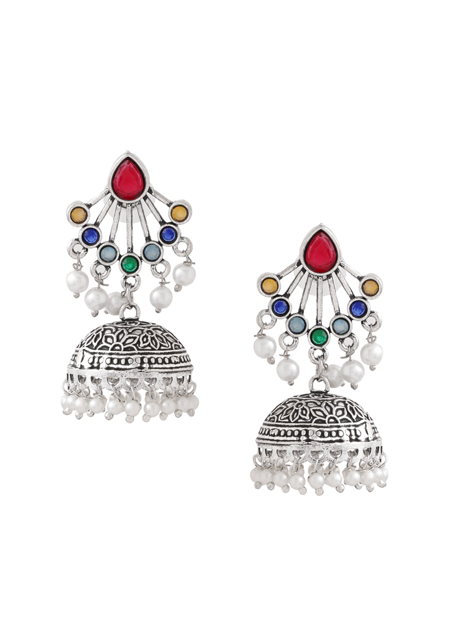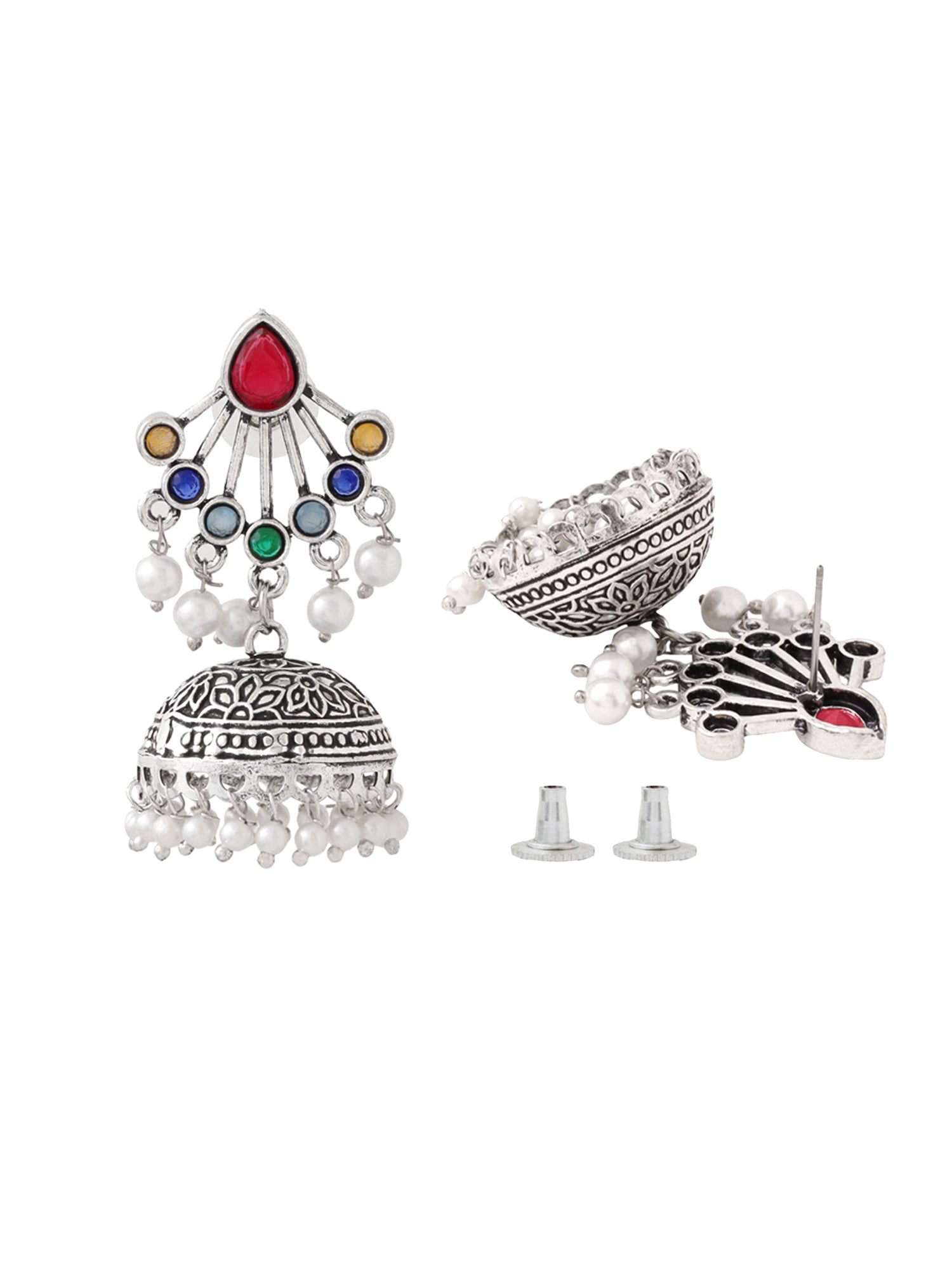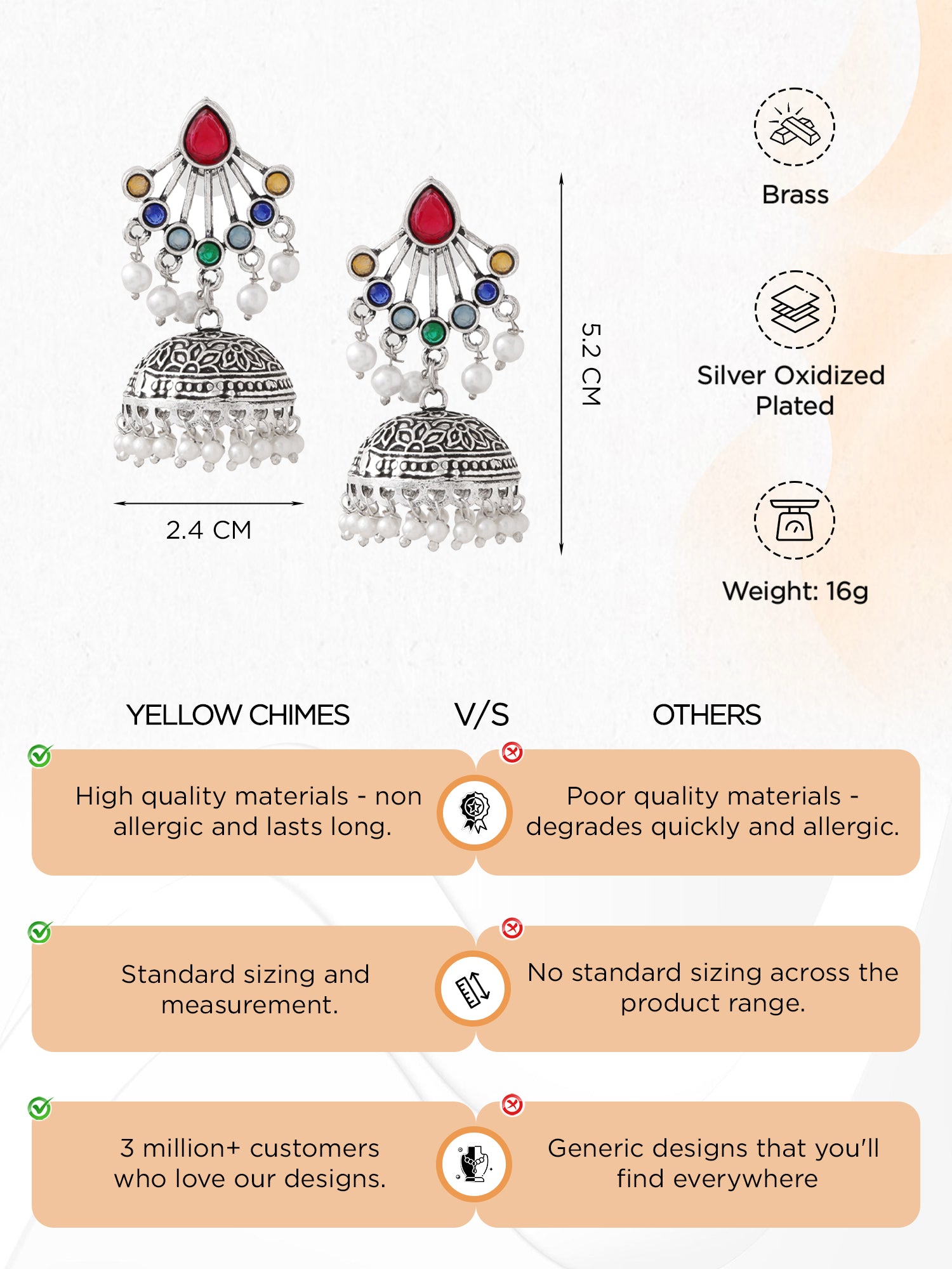 Silver Oxidised Long Jhumka Earrings - Studded Design | 5.2 cm | Lightweight | Elegant
