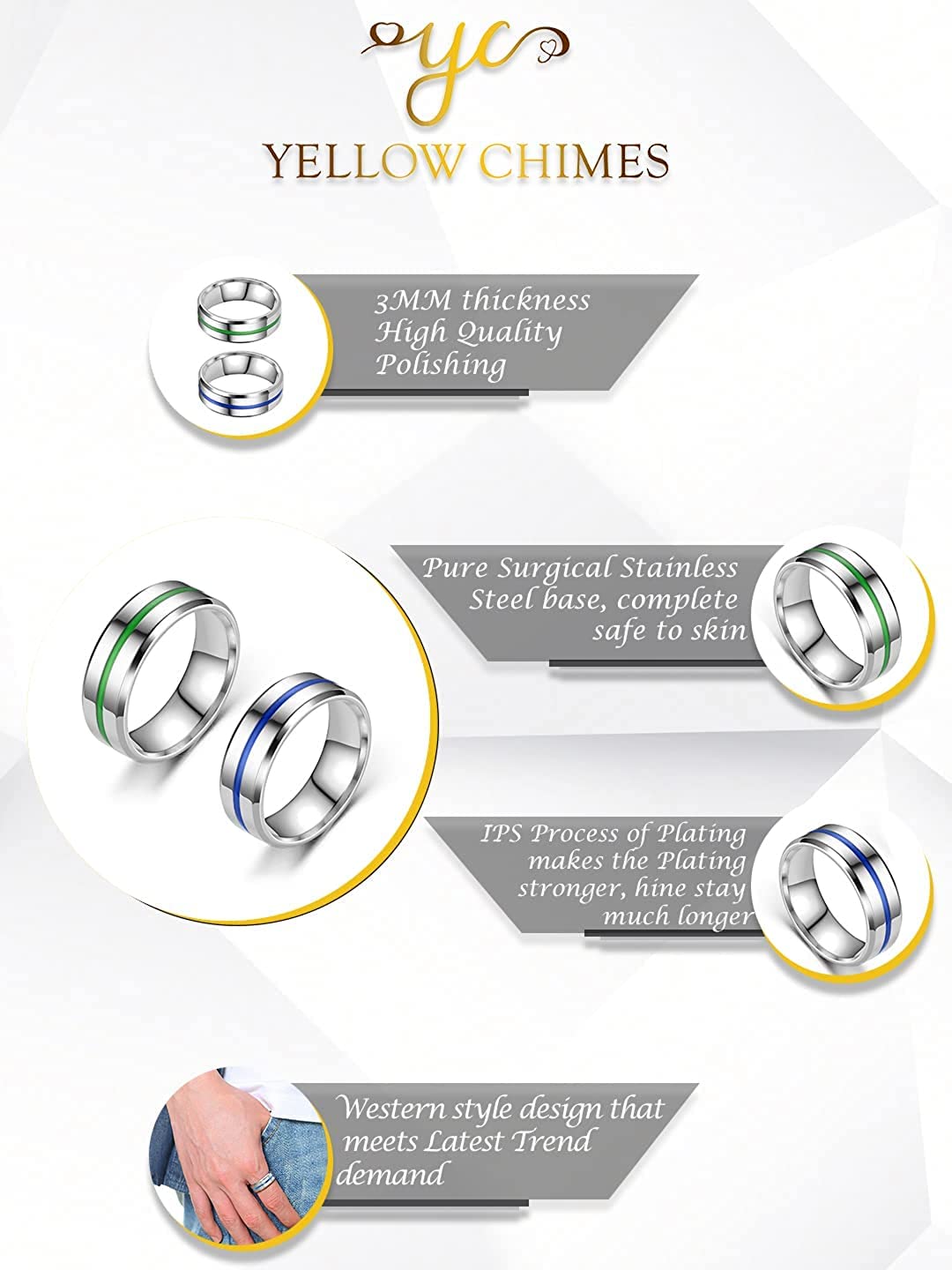 Yellow Chimes 2 pcs Combo Rings for Men Silver toned Stainless Steel Band Designed Contemporary Rings for Men and Boys Combo 2 Pcs Classic, Weighty and Durable, excellent scratch resistant performance Size- US 11, which in 20.6 mm of Diameter. Plating Information:- IPS process of plating makes it never fading of color, and keeps the shine Quality: Stainless steel built, highly resistant to rust and corrosion Smooth polish makes it comfortable to wear Its weight and style makes it suitable for Men GIFT FOR MEN - Ideal Valentine, Birthday, Anniversary gift for someone you LOVE. With our packaging Box, you do not need to opt-in for any additional gift packagingThe product comes in a beautiful Elegant Jewellery Box/ Pouch