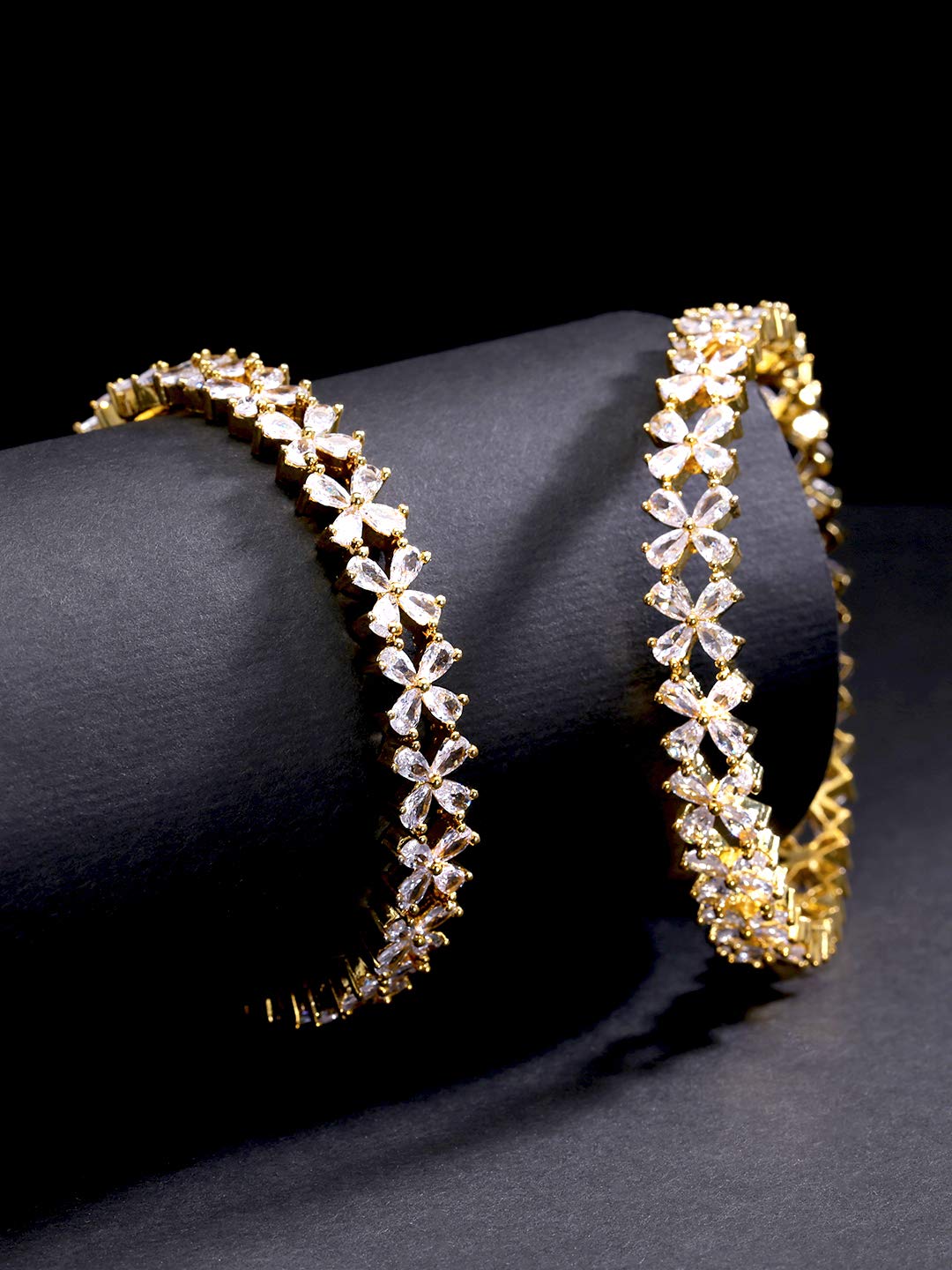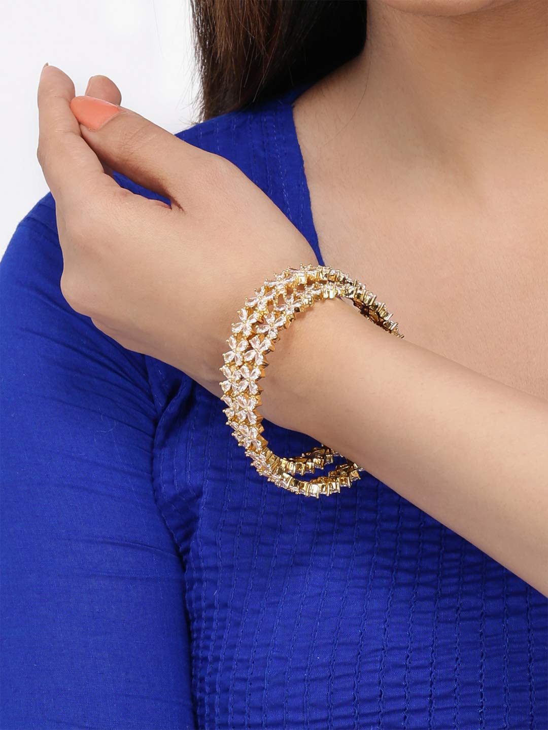 - Elegant Pretty adorable Stylish white Ad/American Diamond Crystal Studded 18k Gold Plated Classic Designer Floral 2 Pcs Traditional Bangles Jewellery are Ethnic yet Contemporary hold in its Design,can be worn on any Occasion to boost up your Attire Looks.