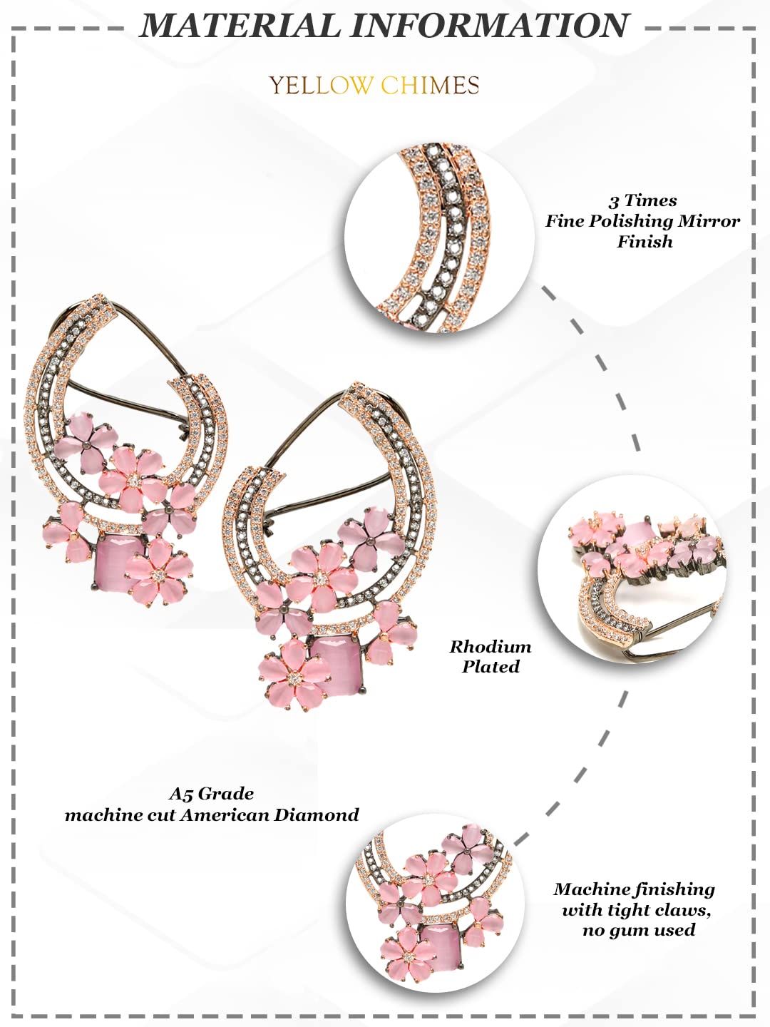 Yellow Chimes American Diamond Earrings for Women Rhodium-Plated Pink AD-Studded Floral Stud Earrings For Women and Girls Beatiful & Trendy: These rhodium-plated AD-studded flower earrings is designed and crafted with perfection. Very feminine, this must-have design can be worn on any occasion to boost up your style factor and enhance the ultra beauty factor. Indian, or Western, this gives a glamorous looks 2 Unit overall , 1 pair of Earings. Size: The size of Earings is 5 CM in Length and 3.5 CM in Width Produced under Quality Control; One by One Checking; Focus on Detail Processing.Beautiful Looks at One Glance- with Intricate High Polish creates Glamorous Reflections and adds Luxurious Looks Skin friendly- Alloy (Base: Brass)Nickel free and Lead free as per International Standards Gift for women - ideal valentine, birthday, anniversary gift for someone you love. with our packaging box, you do not need to opt-in for any additional gift packagingThe product comes in a beautiful elegant ready-to-gift box