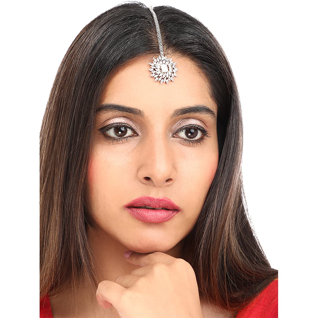 American Diamond Maang Tikka for Women Rhodium Plated High Grade Authentic White AD Jewellery Maang Tikka for Women and Girls