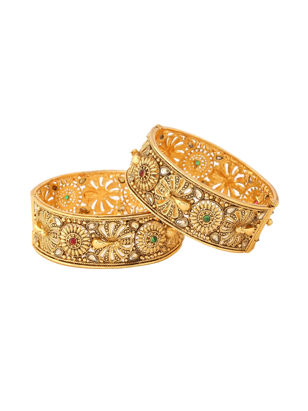 - Traditional Bangles Set with gold plating features Gemstones embellishments and Artistic design. The Bangles comes with screw nail for the wear to be smooth. Adorn yourself with these beautiful bangles to create a feminine classic looks that makes everyone eyes on you.