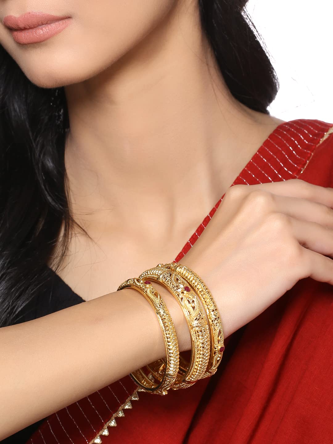 - Traditional Bangles Set with gold plating features embellishments and Artistic design. Adorn yourself with these beautiful bangles to create a feminine classic looks that makes everyone eyes on you.