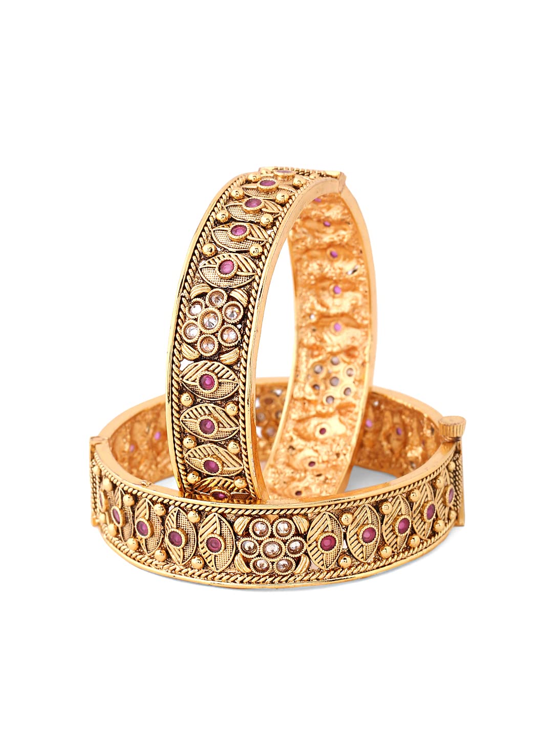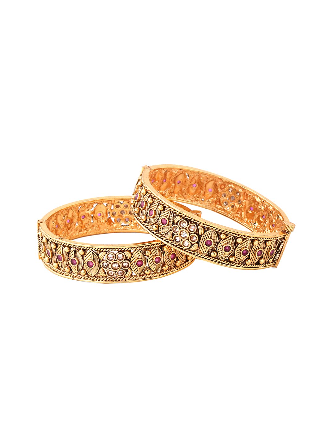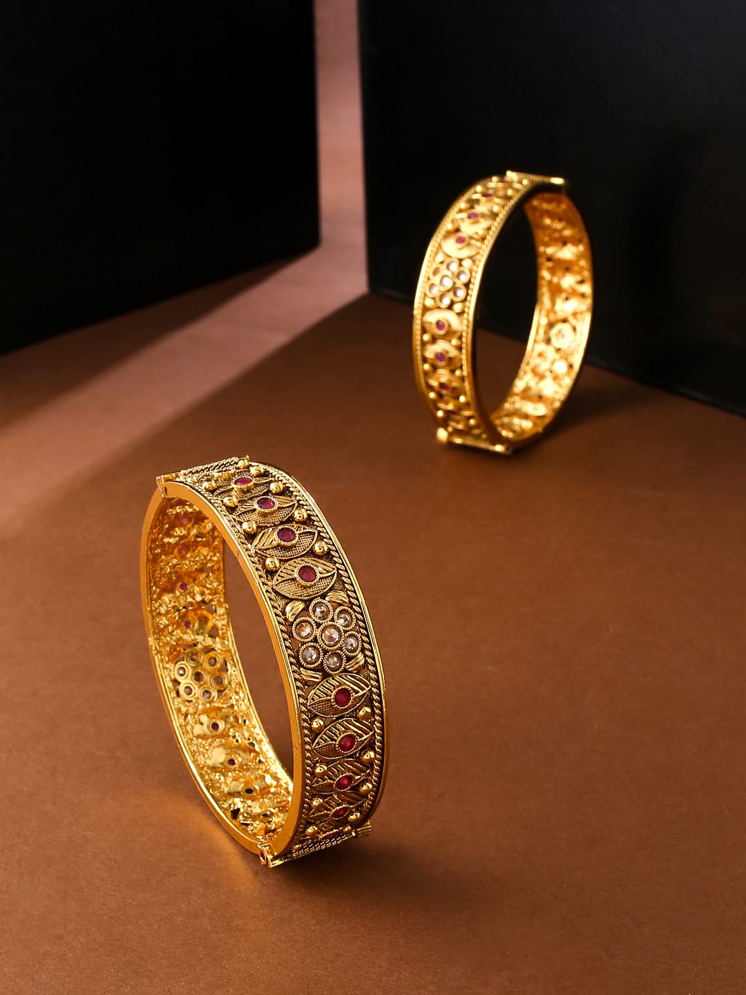 - Traditional Bangles Set with gold plating features Gemstones embellishments and Artistic design. The Bangles comes with screw nail for the wear to be smooth. Adorn yourself with these beautiful bangles to create a feminine classic looks that makes everyone eyes on you.