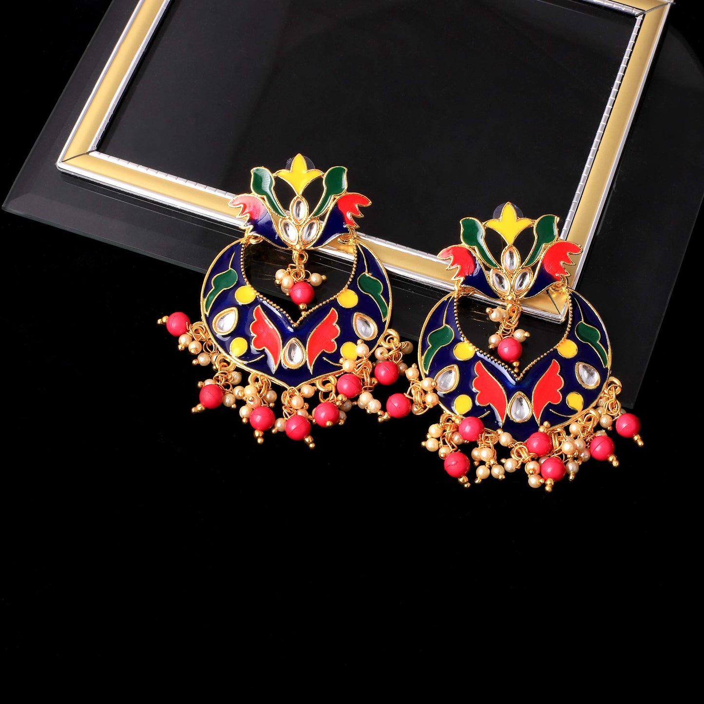 Yellow Chimes Beautifully Enamelled Stylish Gold Plated Meenakari Chandbali Earrings for Women and Girls… Beauty - Stylish Fancy Meenakari Traditional Chandbali Earrings with lovely combination of Colors from Your Own Yellow Chimes. These designer earrings will complement any Occasion Ethnic Wear. The color complements all outfits and may be worn as a statement piece to any occasion. Quality - These beautiful earrings are handcrafted in Copper with Pearls of good quality. Coated with high Quality and thickness Gold polish. Go ahead and make them all yours right away Beautiful Looks at One Glance- with Intricate High Polish creates Glamorous Reflections and adds Luxurious Looks Skin friendly: Nickel free and lead free as per international standards. Anti-allergic and safe for skin Yellow Chimes has come up with Hand Picked Designs , Export Quality Base and High Quality Polish Traditional Jewellery in most economic price for its all Fans. We collect raw material after researching market all around India, picking the specialty of each area and assemble them to make hand crafted Surprisingly Loving Traditional Jewellery. We assure of your Trust on Us which has been there since so many years.