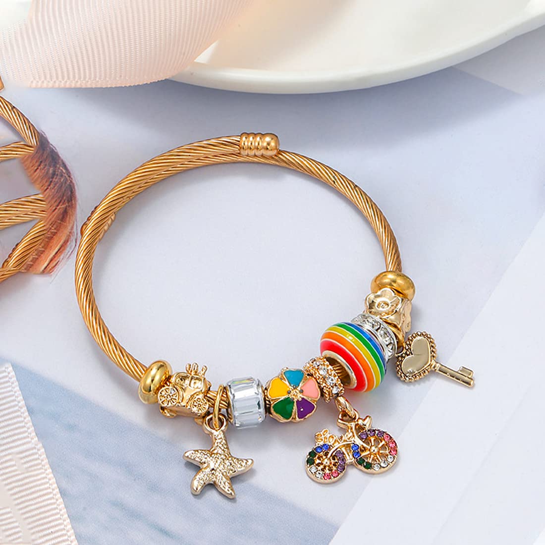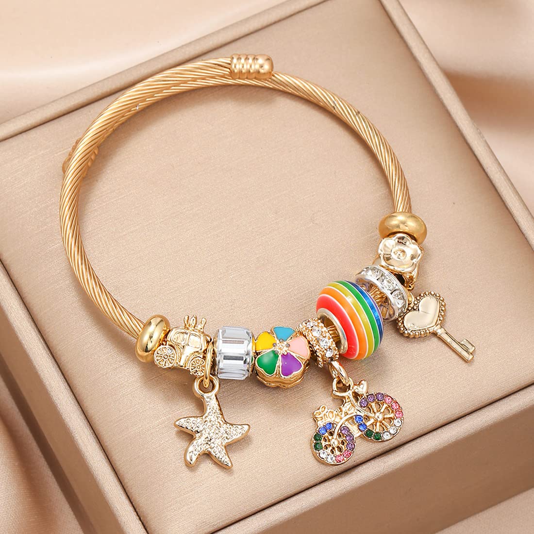 Bracelet For Women And Girls Fashion Golden Charm Bangle Bracelets | Muti Shaped Charms Gold Plated Bangle Style Bracelet | Birthday And Anniversary Gift For Women & Girls