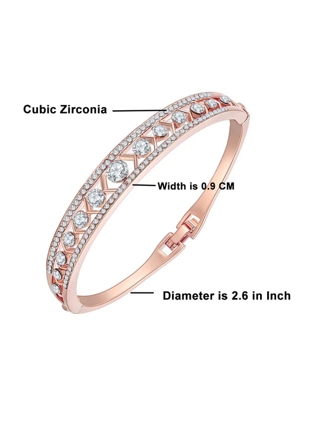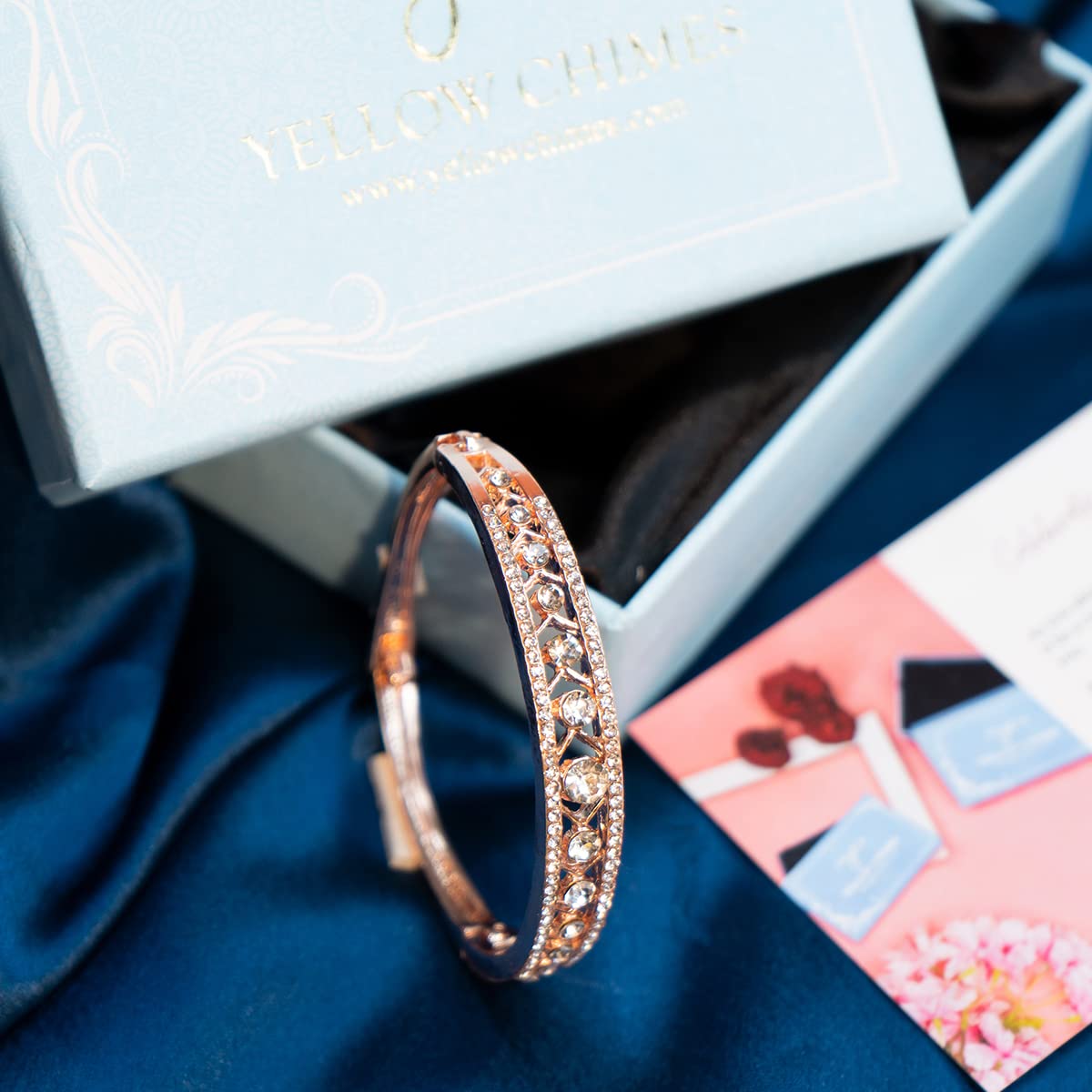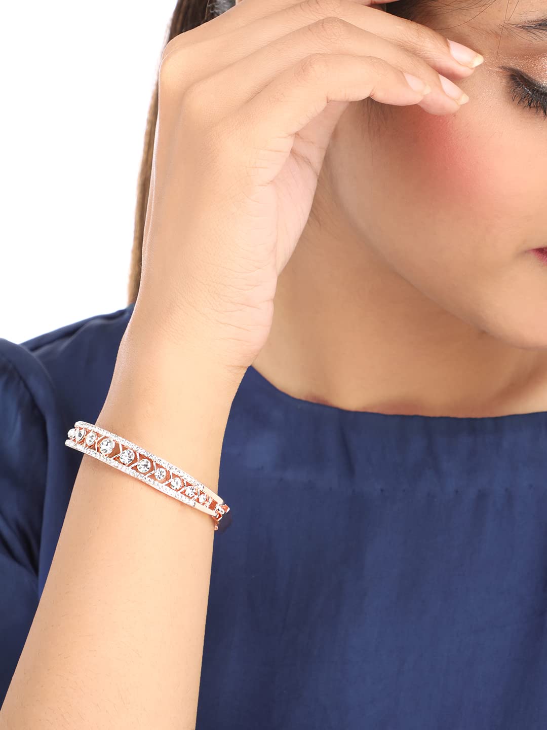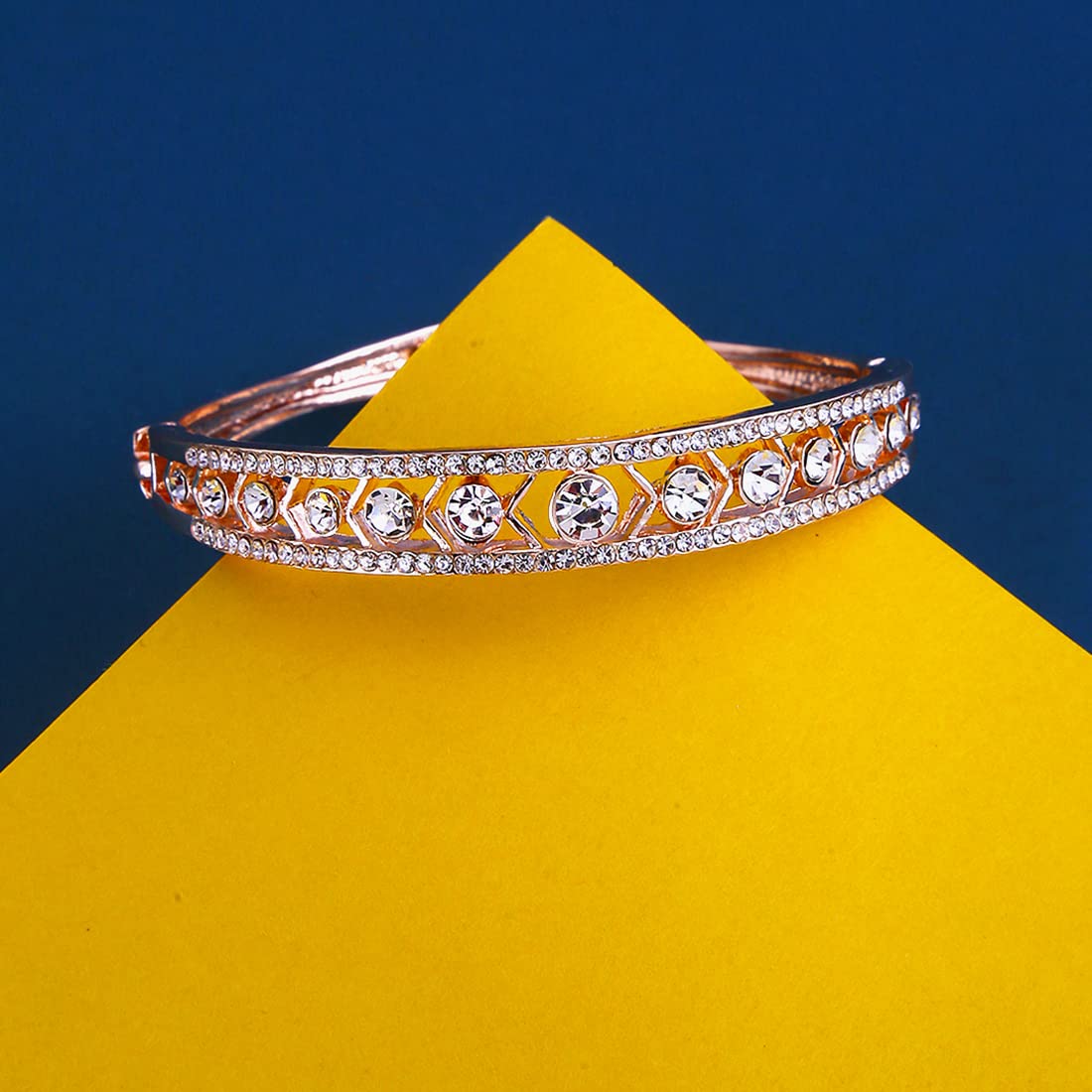 - Elegant Rose Gold Plated White Colored Stoned Crystal Kadaa Studded Bbracelet for Women. Eye catched Feminine Smooth Finished Bracelet. Our Product is perfect for valentines Anniversary Birthday gift for girlfriend and Wife.