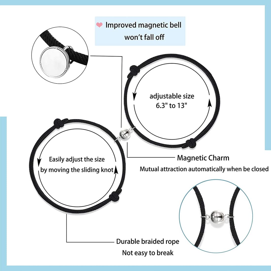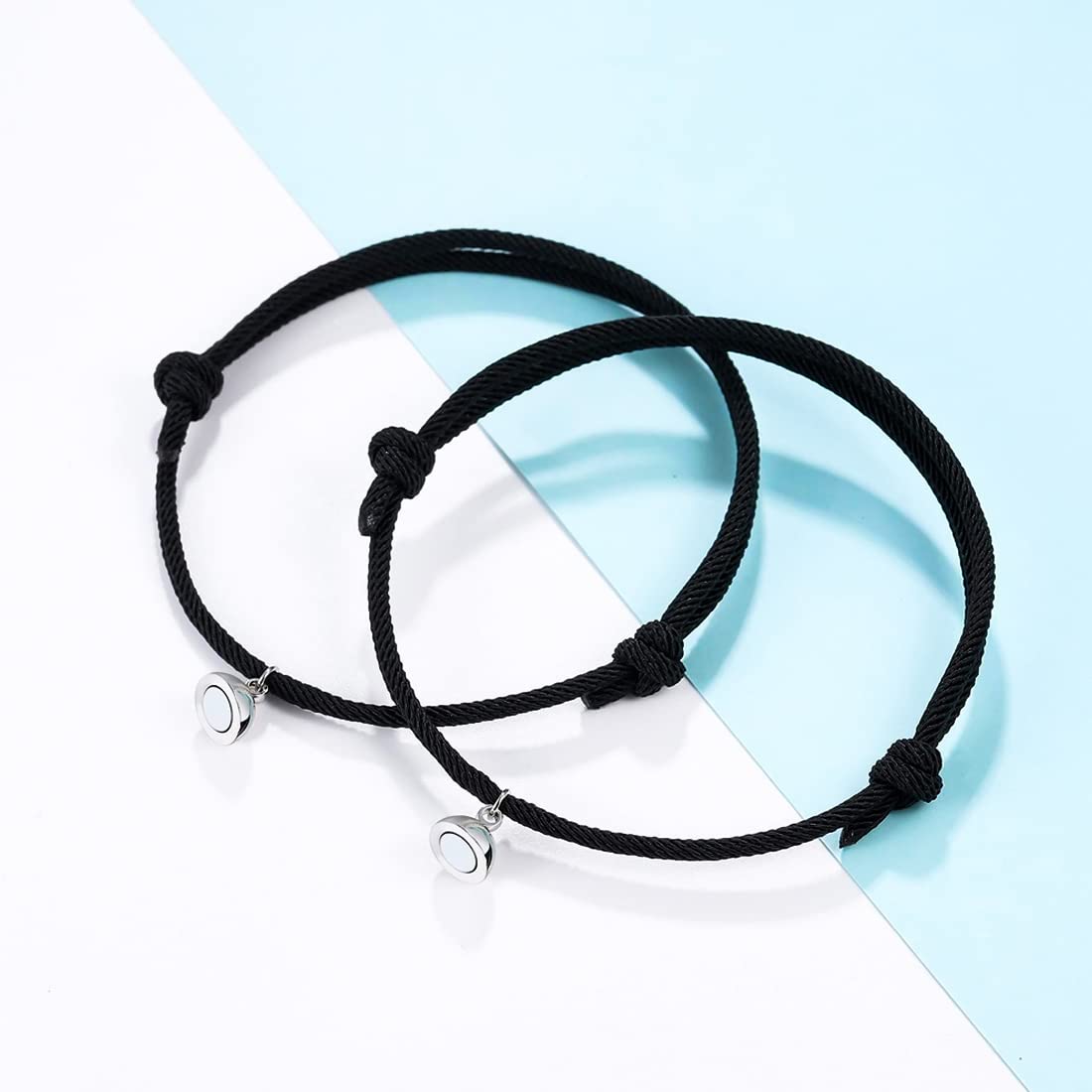 • 2 pcs of Couple Bracelet Set with Magnetic Charms durable braided rope not easy to break easy adjust to size by moving the sliding knot. Our Product is perfect for valentines Anniversary Birthday gift for girlfriend boyfriend Wife and Husband.