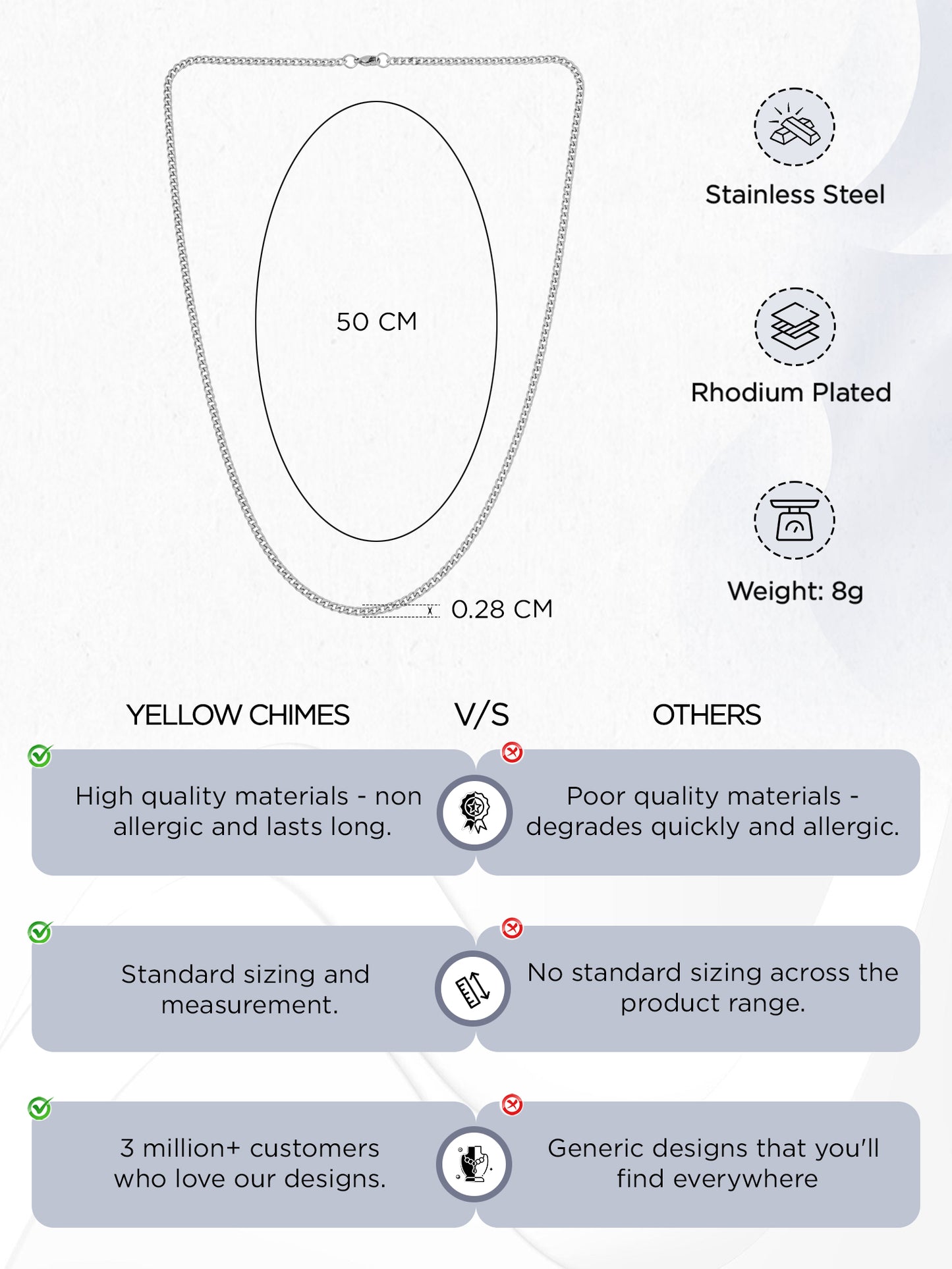- Comfortable Fit: With a size of 50 CM (19.68 inches) and a thickness of 2.8 MM, it provides a comfortable and stylish fit.